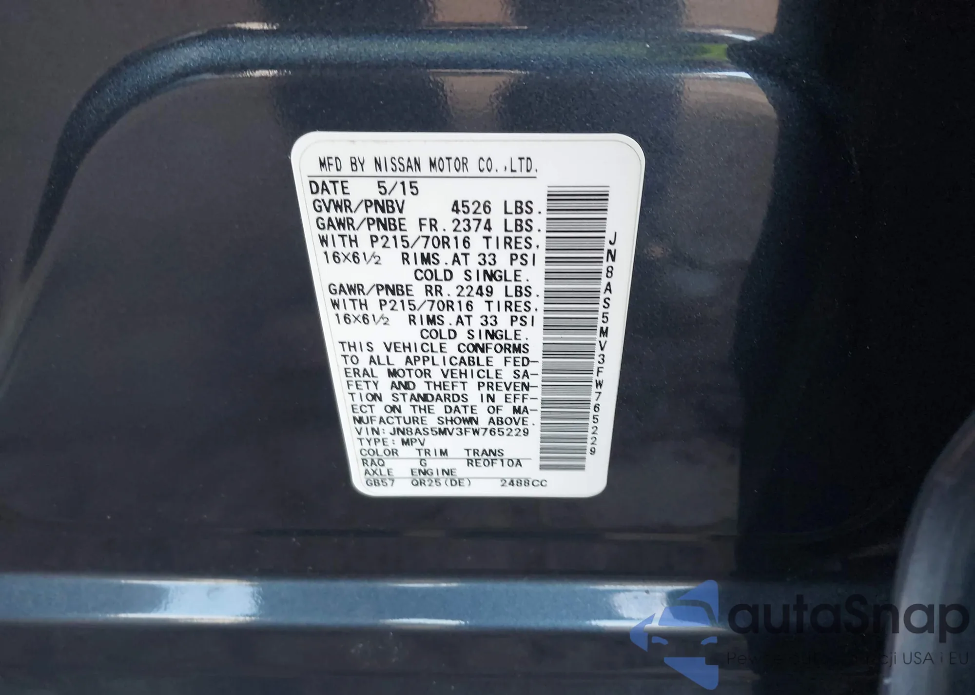 • VIN JN8AS5MV3FW765229