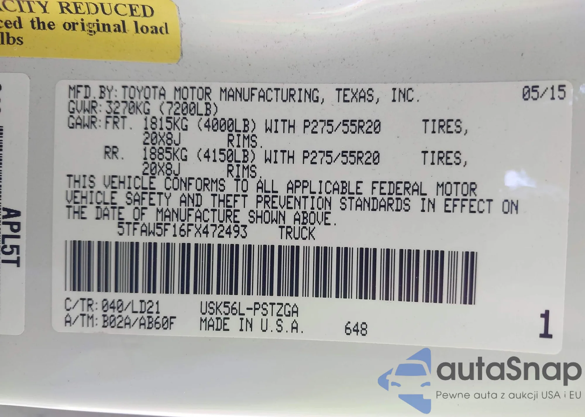 LOT: 43905360 VIN: 5TFAW5F16FX472493
