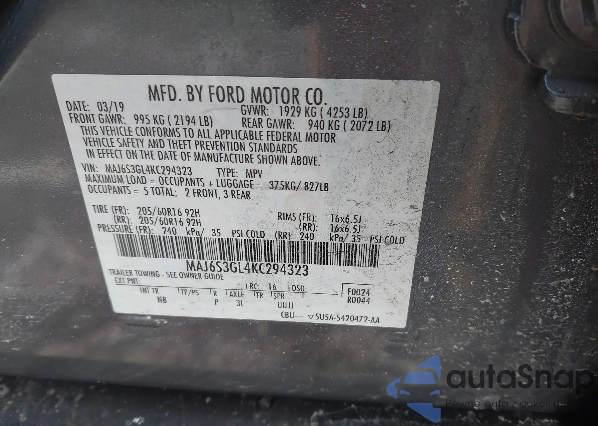 • VIN MAJ6S3GL4KC294323