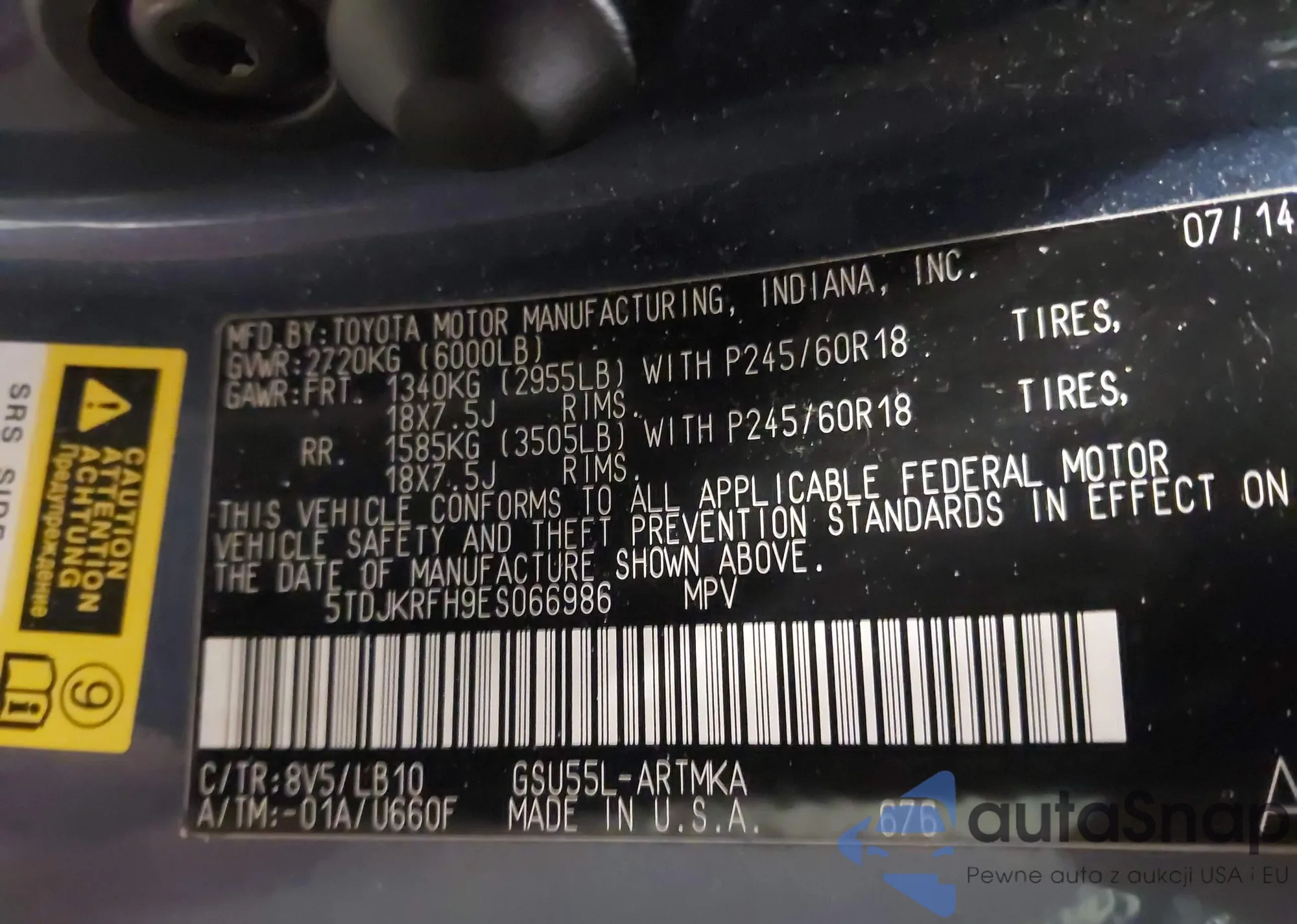 LOT: 44272255 VIN: 5TDJKRFH9ES066986