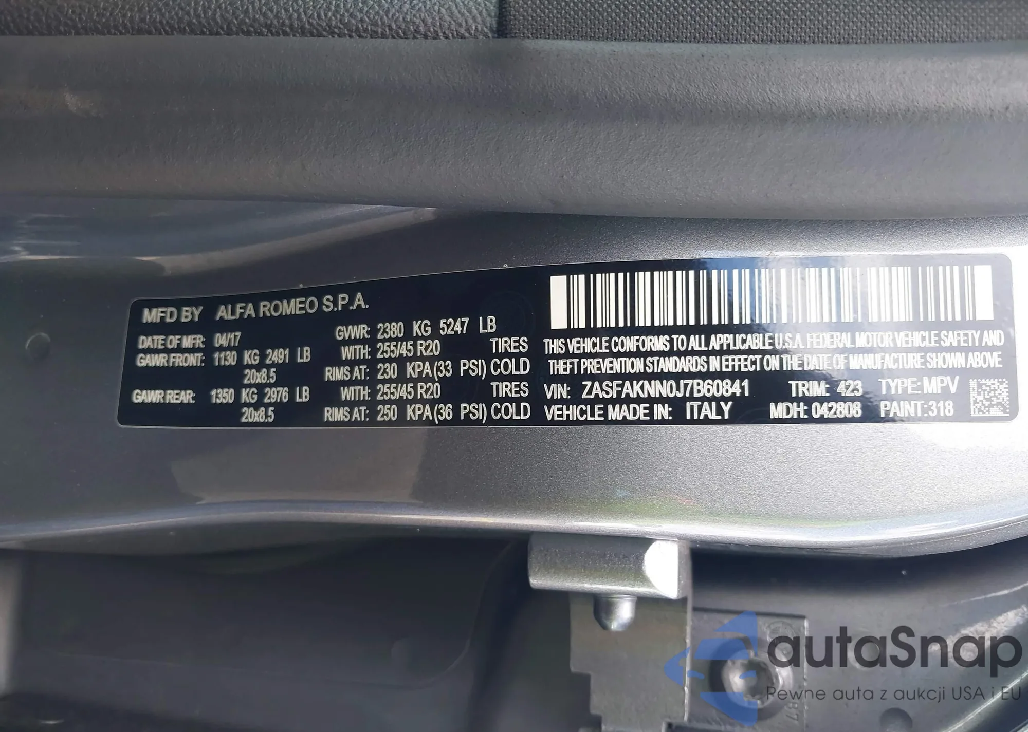 LOT: 44230788 VIN: ZASFAKNN0J7B60841