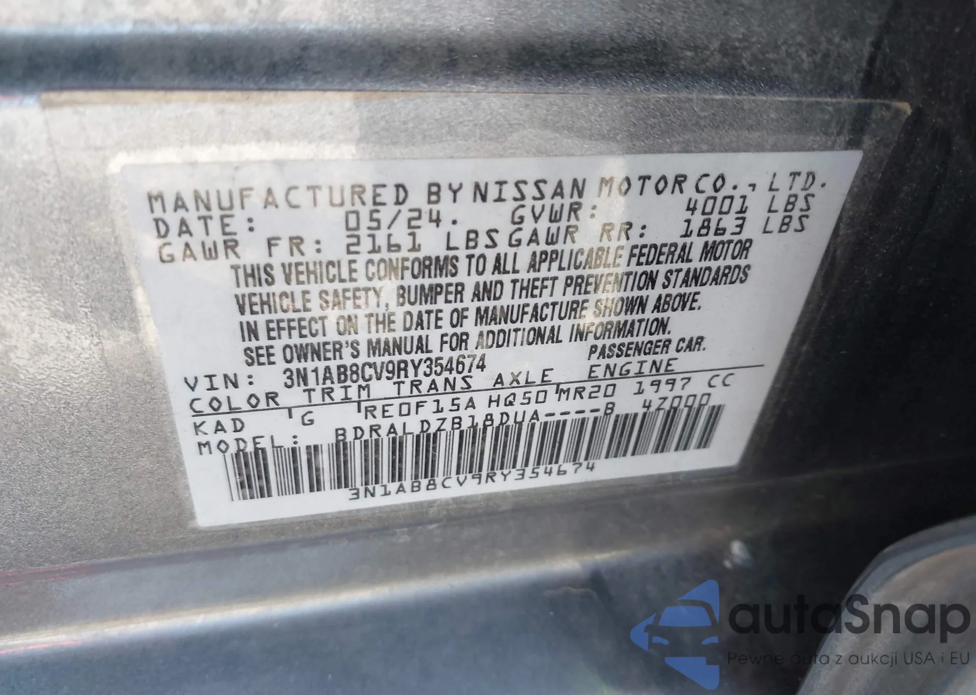 • VIN 3N1AB8CV9RY354674