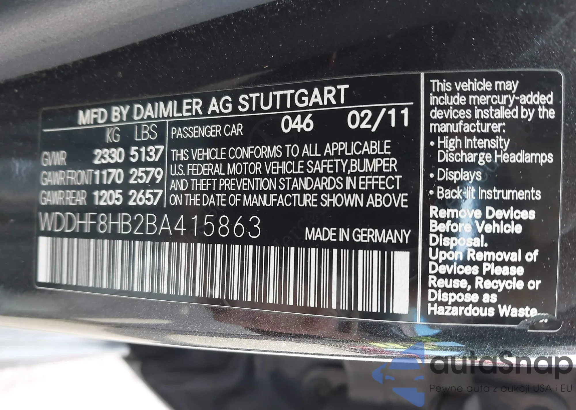 LOT: 44221741 VIN: WDDHF8HB2BA415863