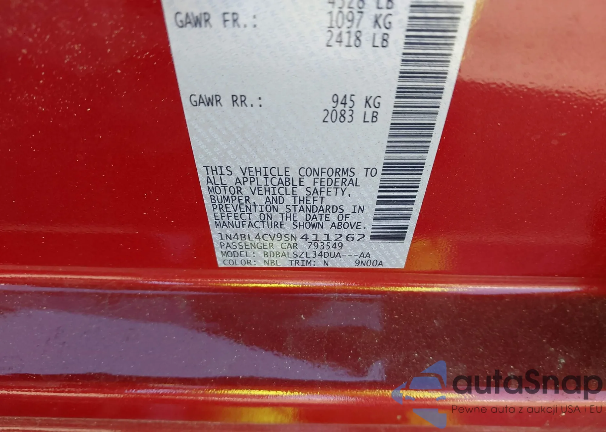 LOT: 43944987 VIN: 1N4BL4CV9SN411262
