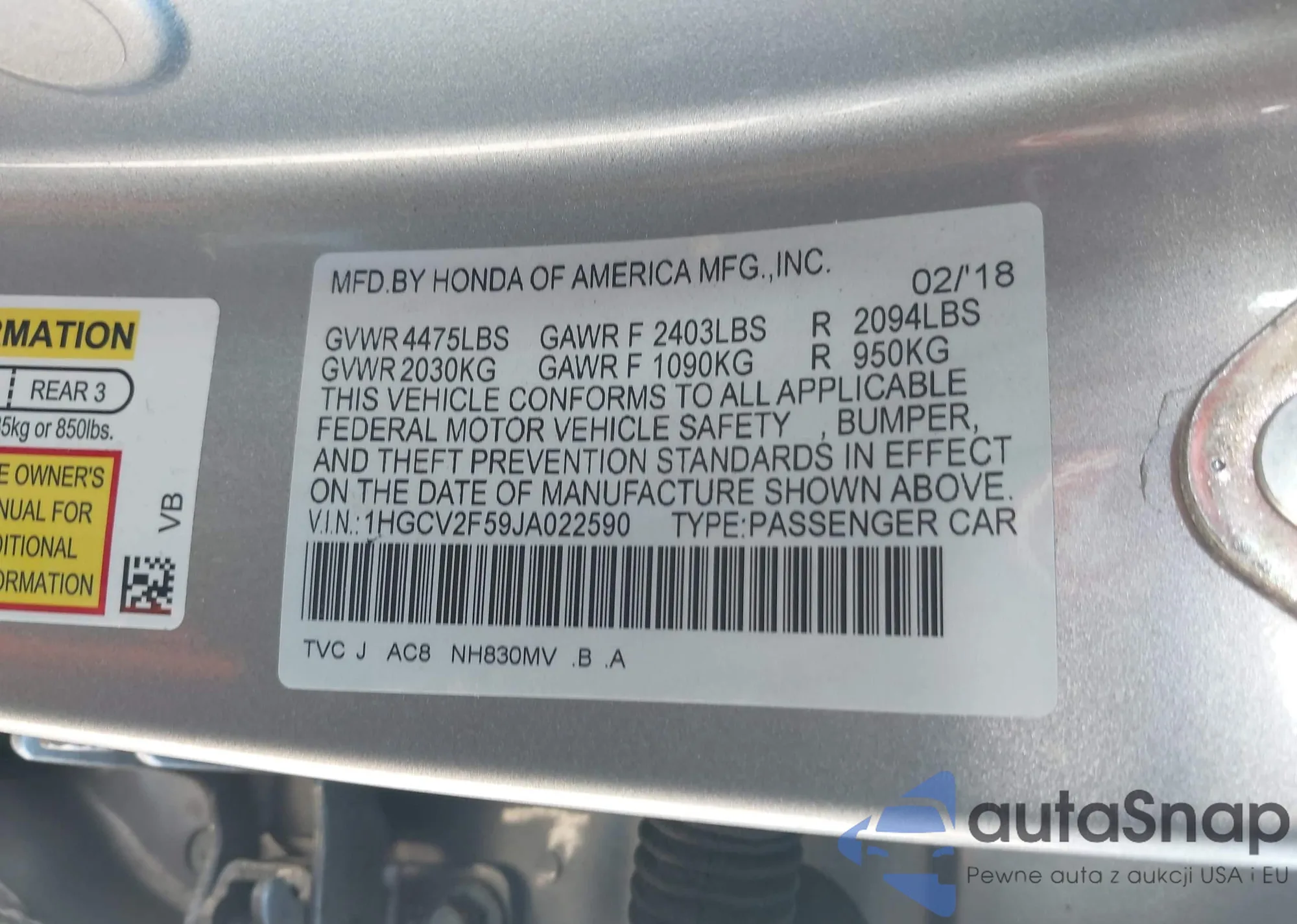 LOT: 44092438 VIN: 1HGCV2F59JA022590