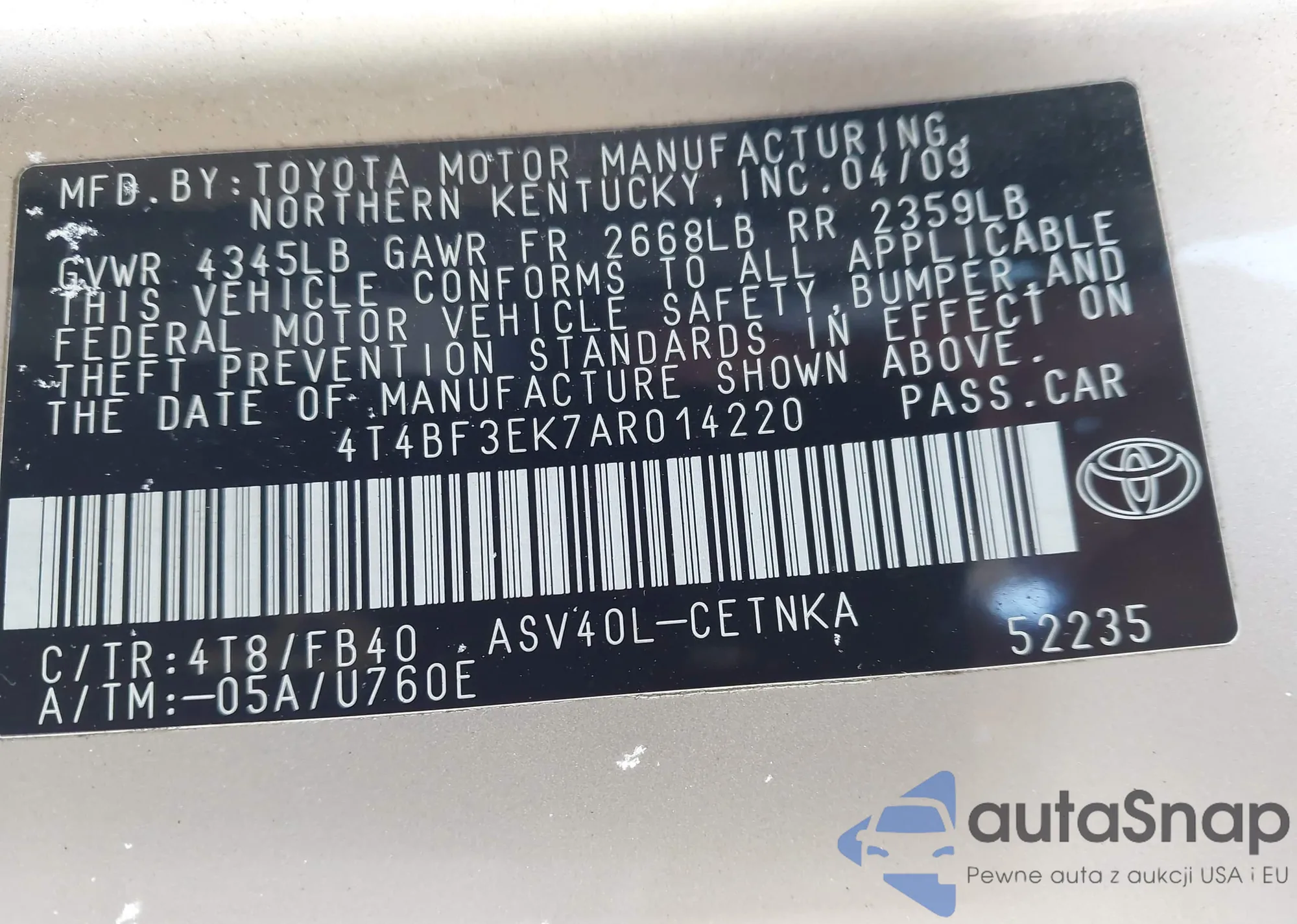 • VIN 4T4BF3EK7AR014220