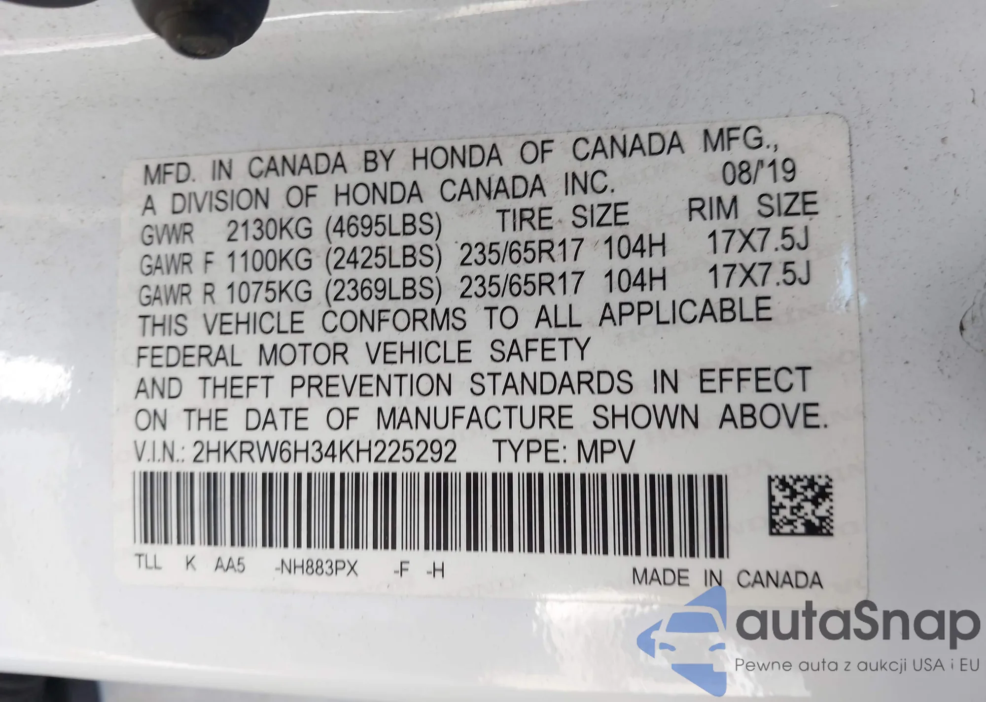 • VIN 2HKRW6H34KH225292