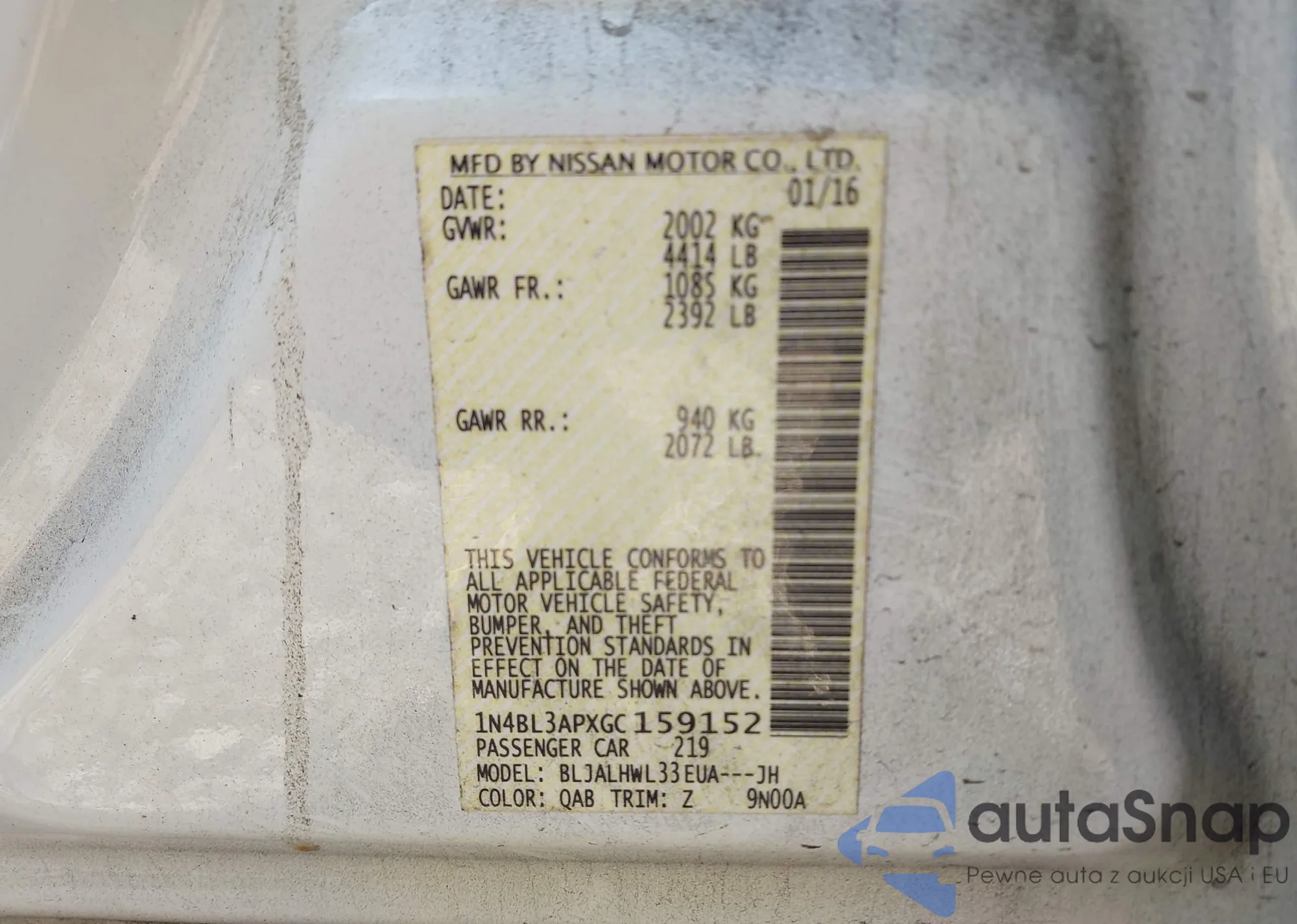 LOT: 43744994 VIN: 1N4BL3APXGC159152