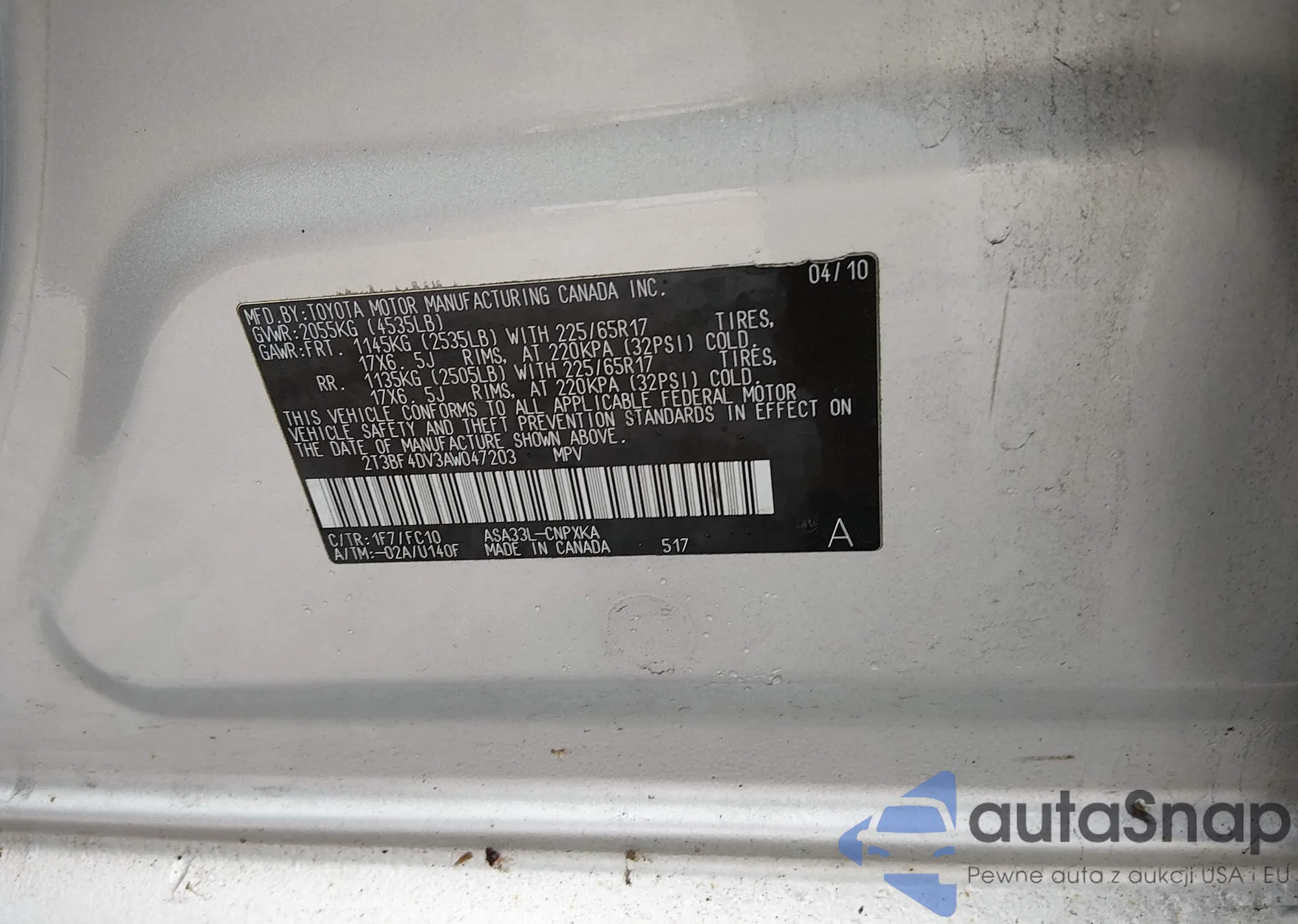 • VIN 2T3BF4DV3AW047203