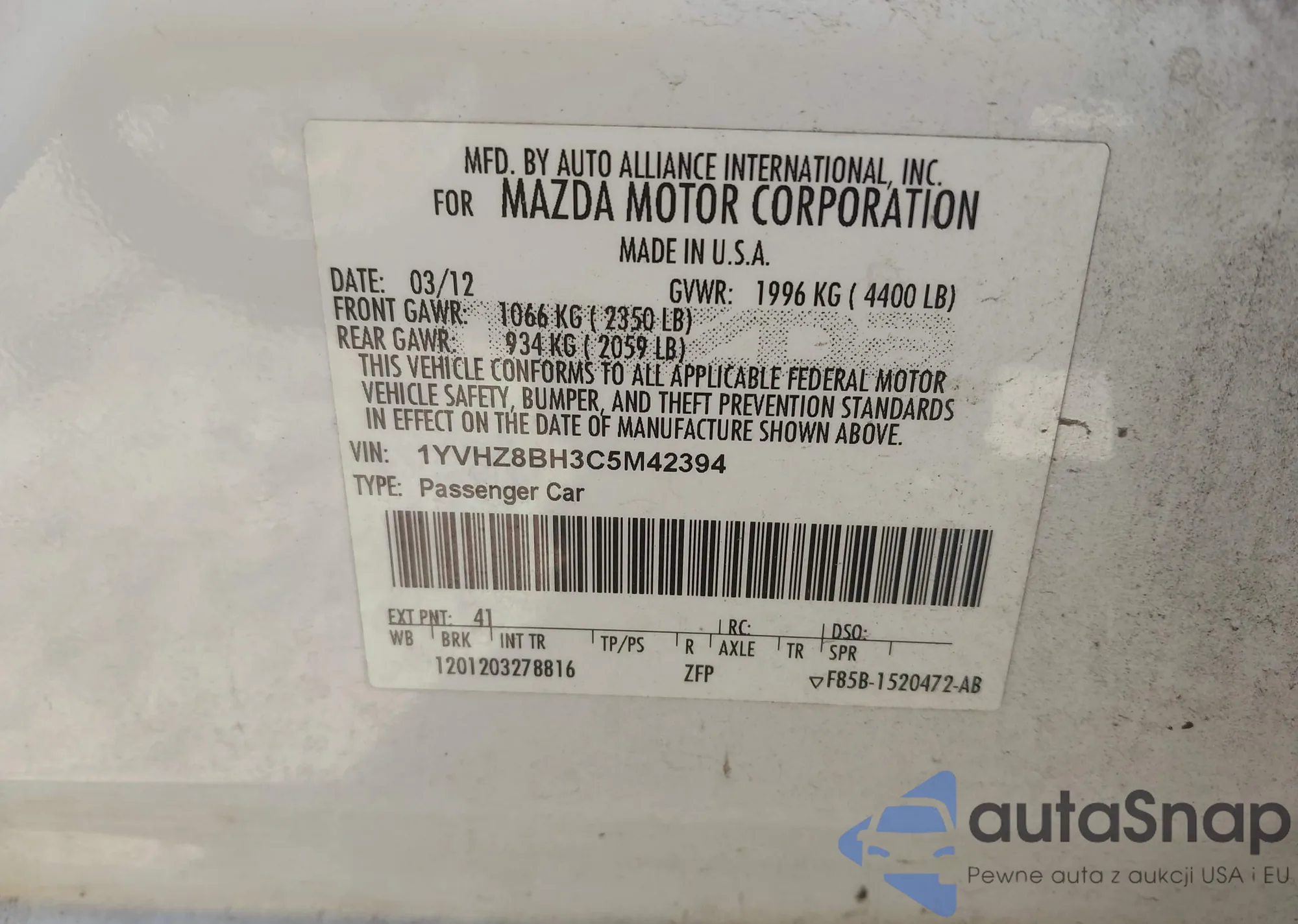• VIN 1YVHZ8BH3C5M42394