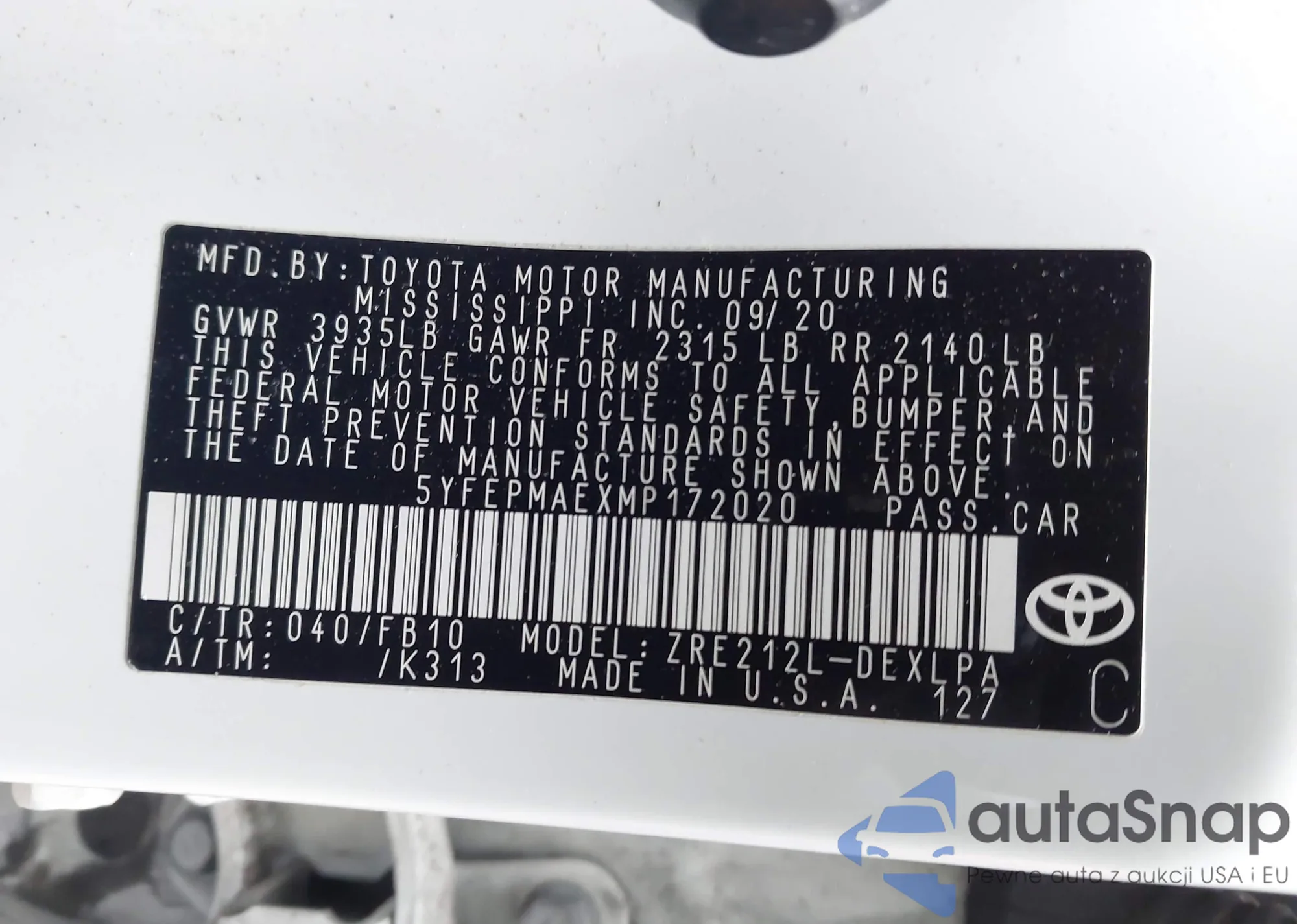 LOT: 44157002 VIN: 5YFEPMAEXMP172020