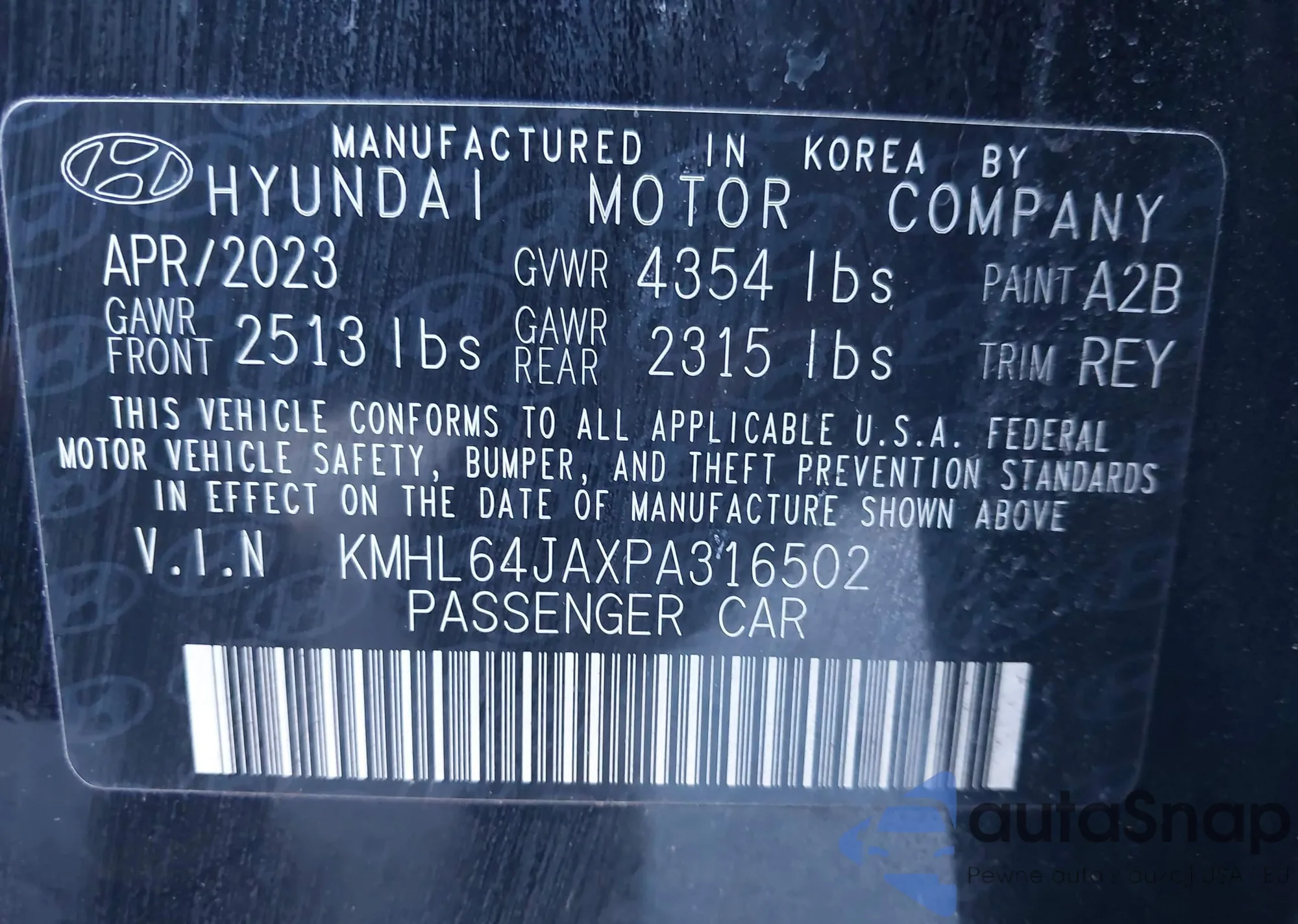LOT: 44104516 VIN: KMHL64JAXPA316502