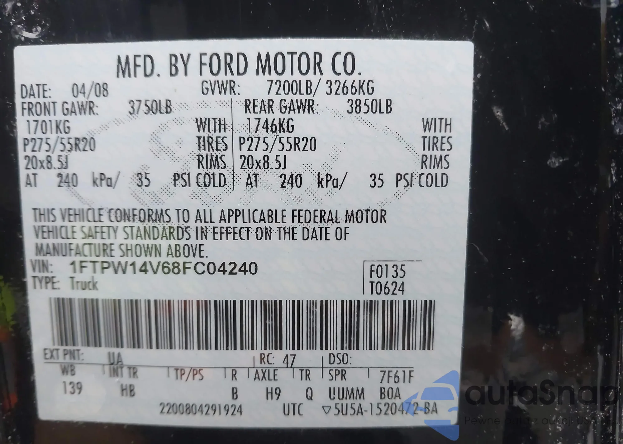 LOT: 44196205 VIN: 1FTPW14V68FC04240