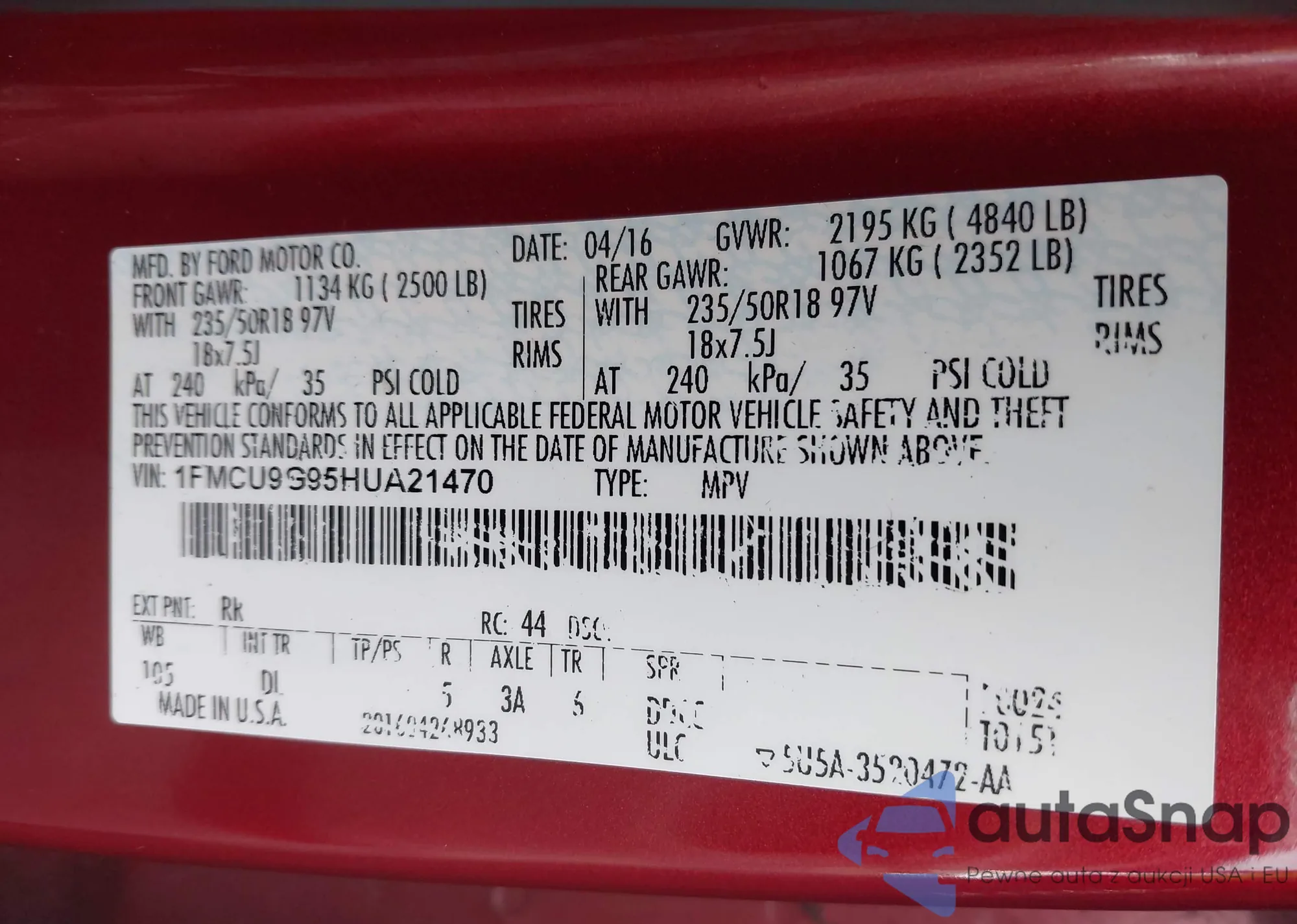 • VIN 1FMCU9G95HUA21470
