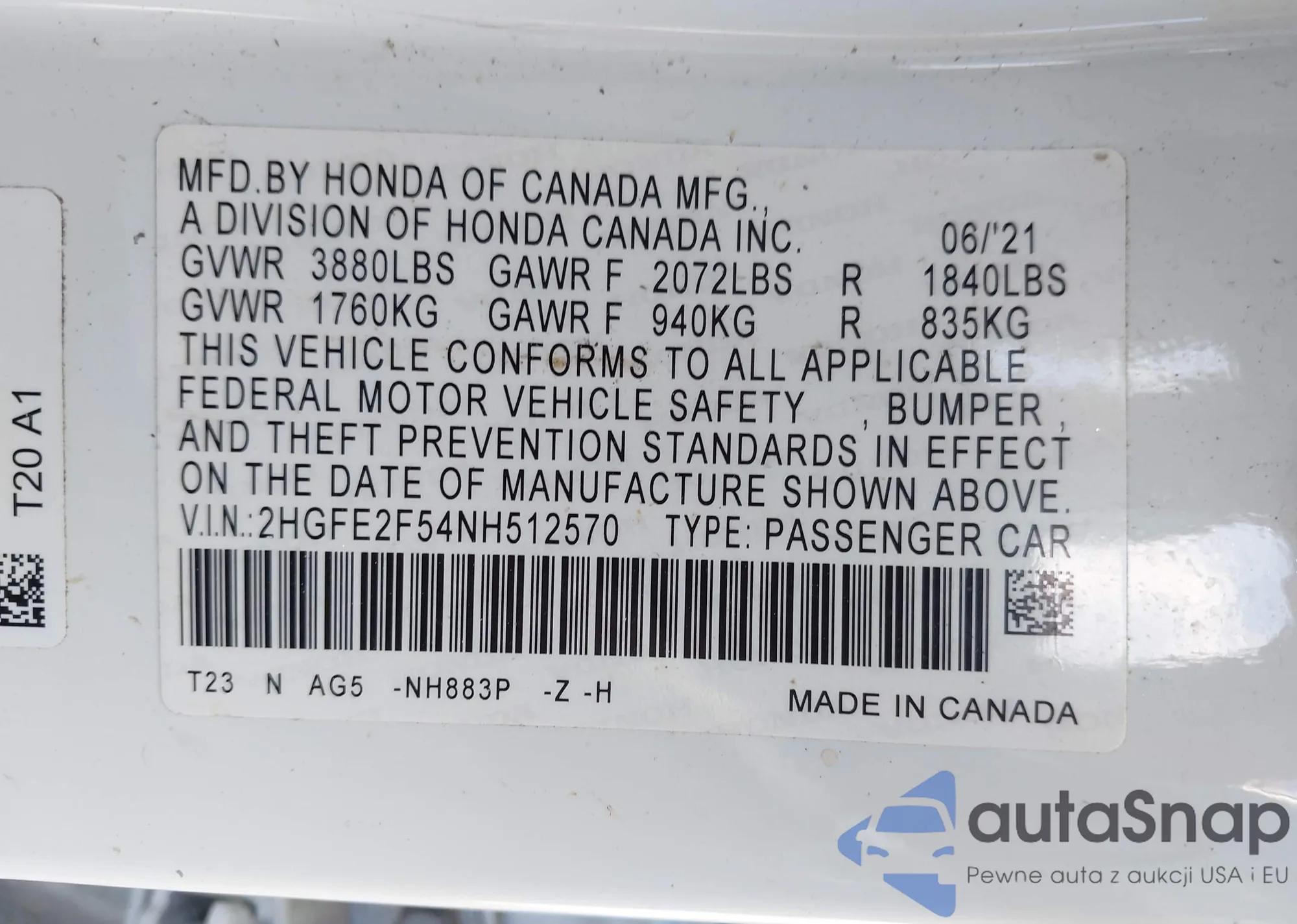 • VIN 2HGFE2F54NH512570