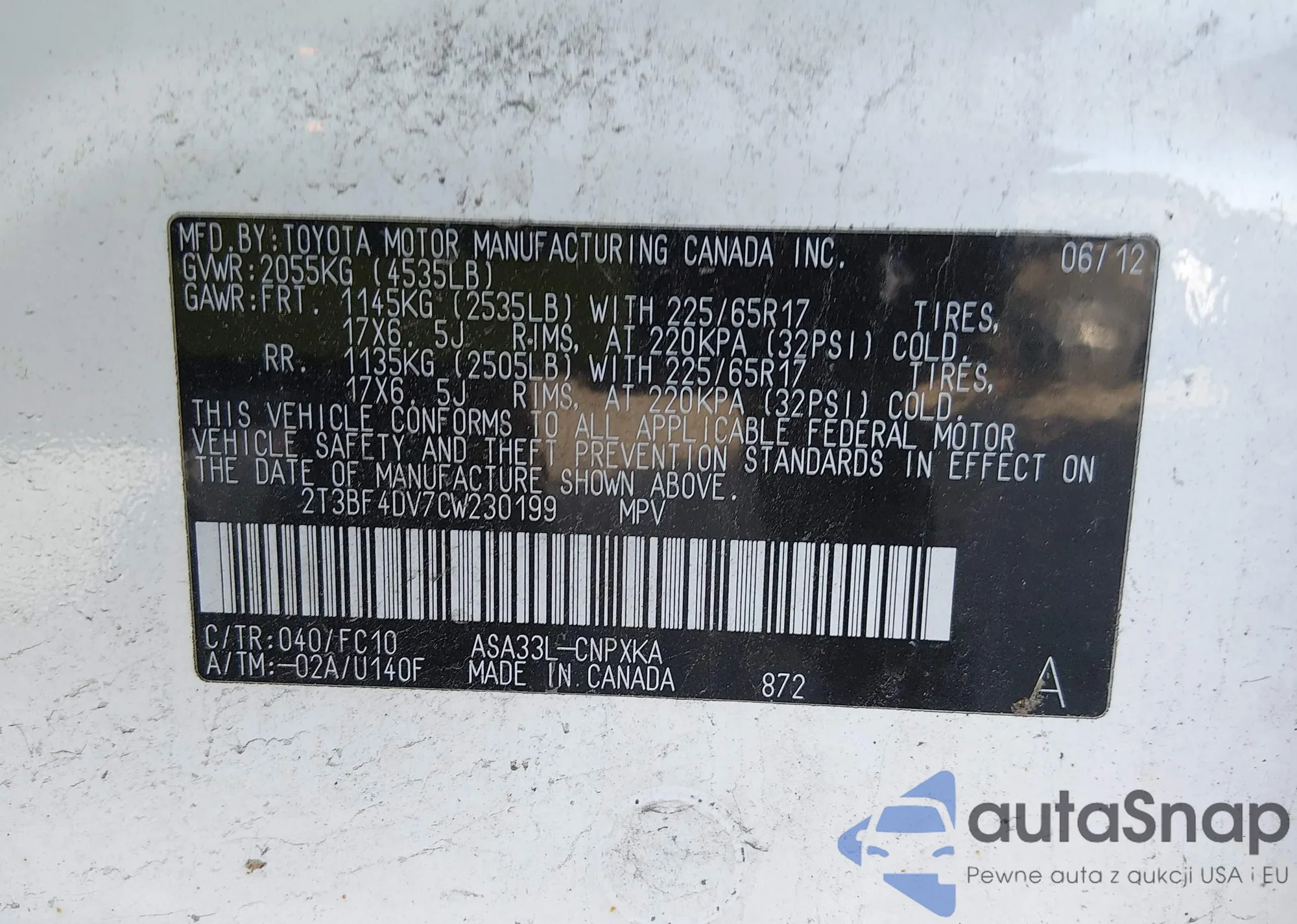 • VIN 2T3BF4DV7CW230199