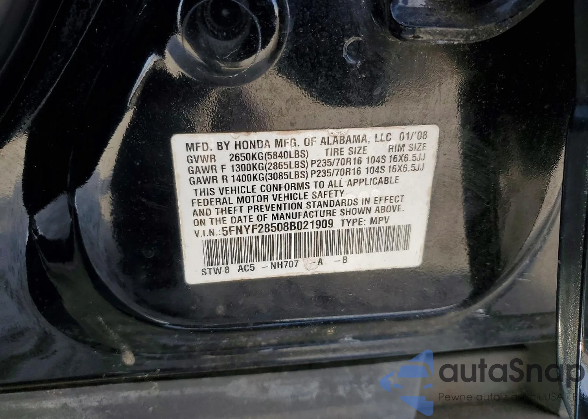 • VIN 5FNYF28508B021909