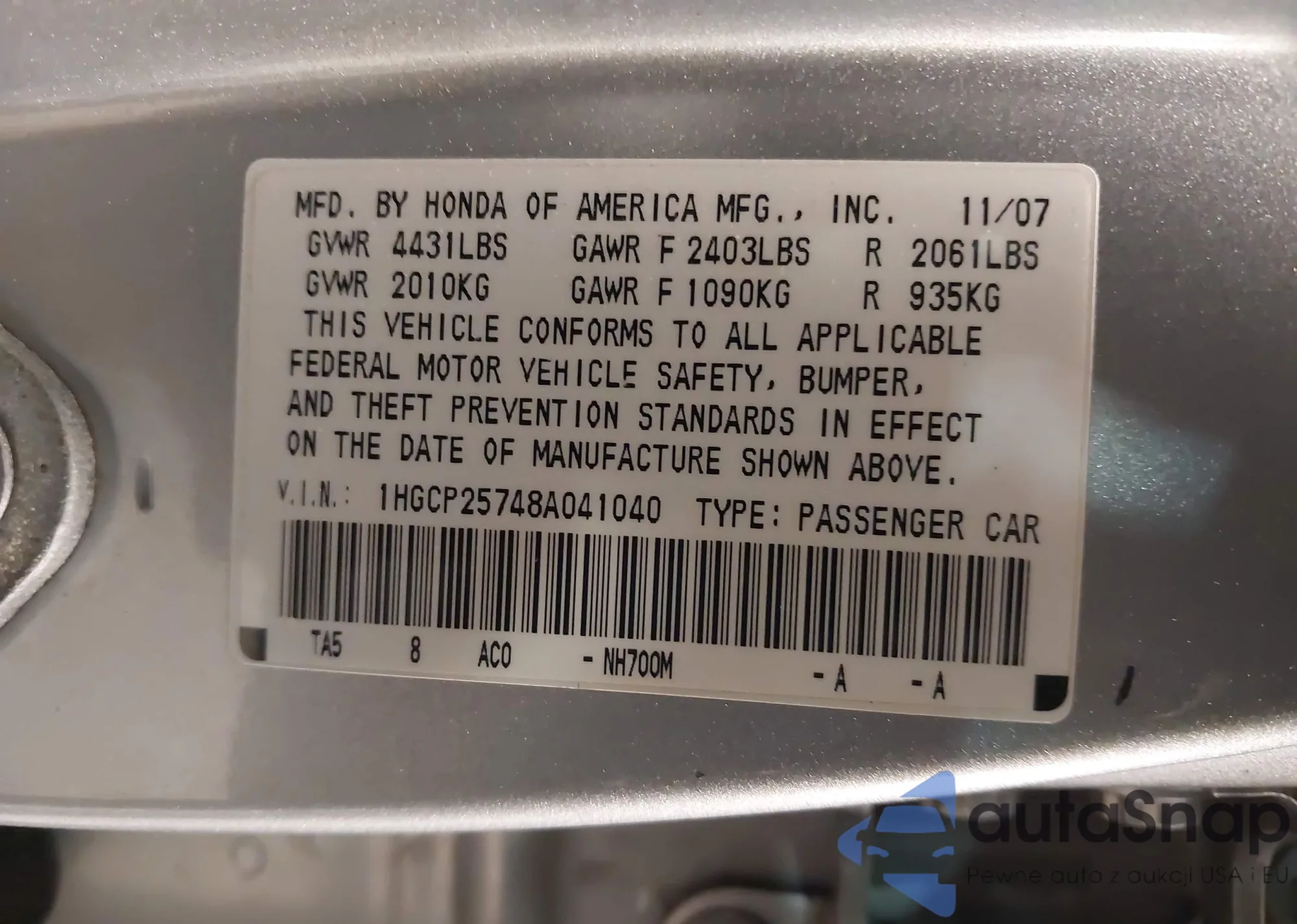• VIN 1HGCP25748A041040