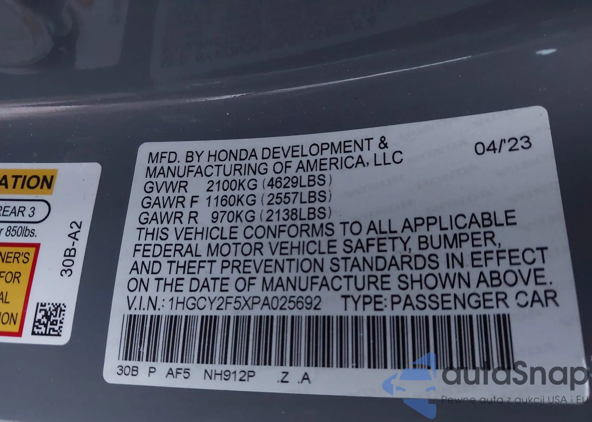 • VIN 1HGCY2F5XPA025692