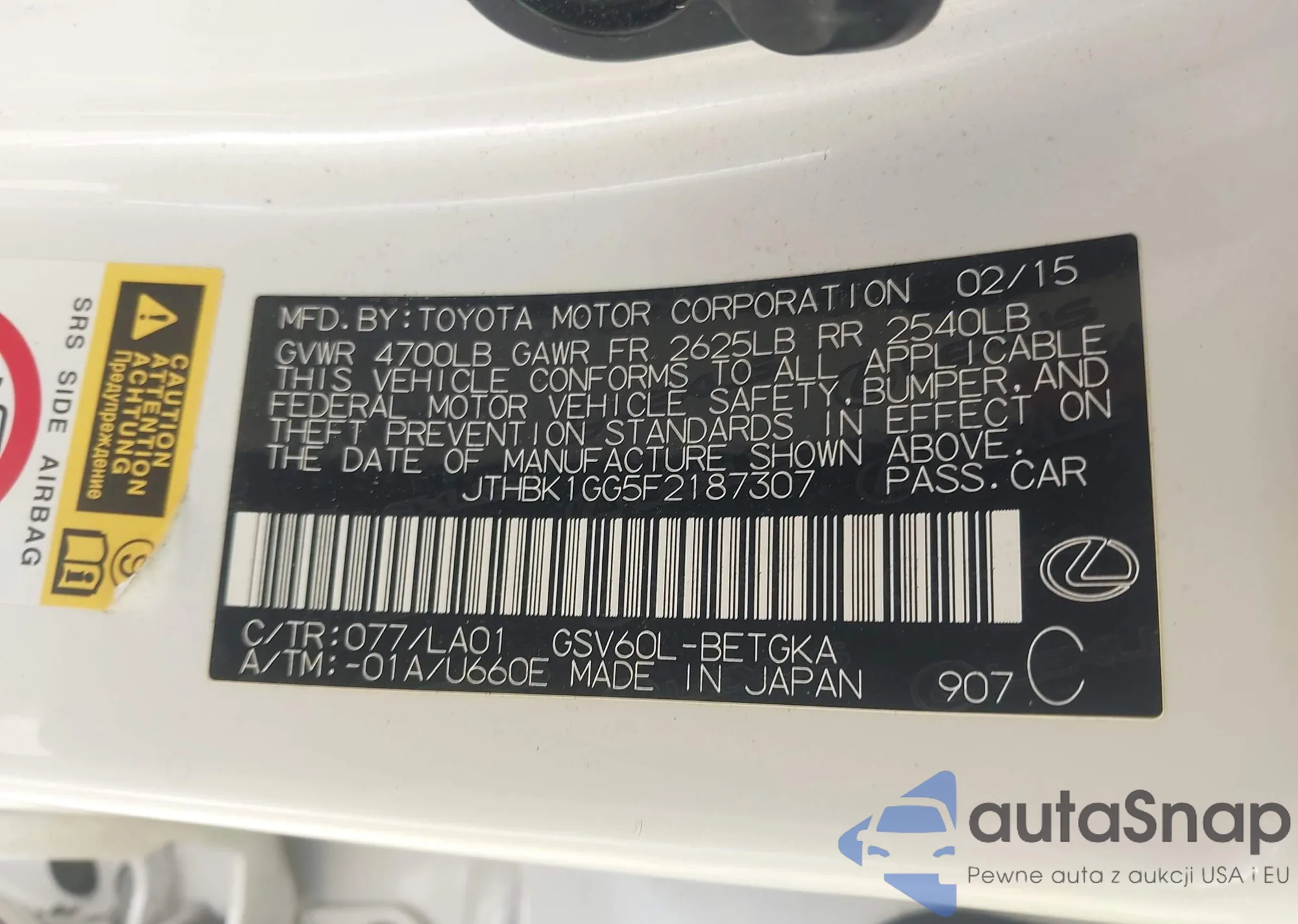LOT: 43951414 VIN: JTHBK1GG5F2187307