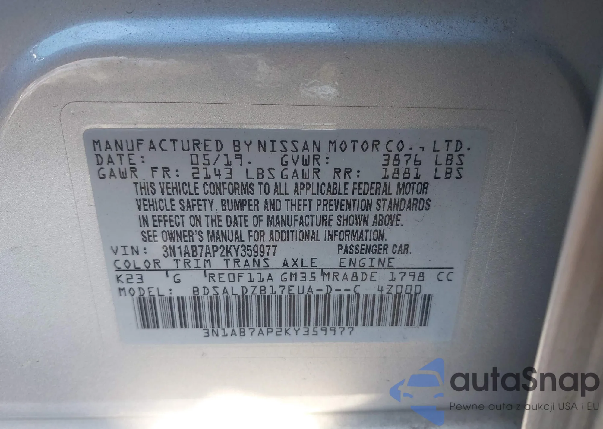 • VIN 3N1AB7AP2KY359977