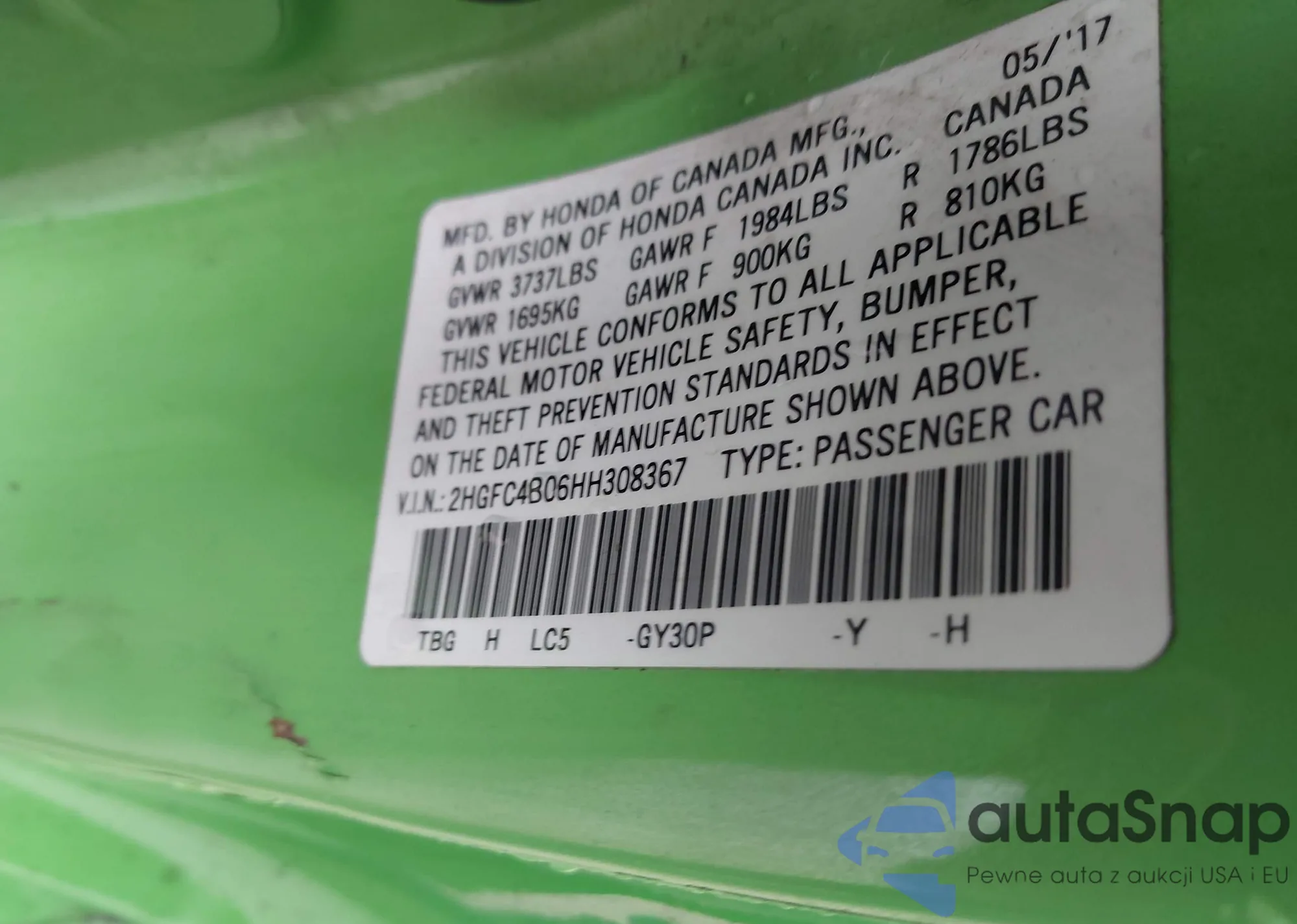 LOT: 44073852 VIN: 2HGFC4B06HH308367