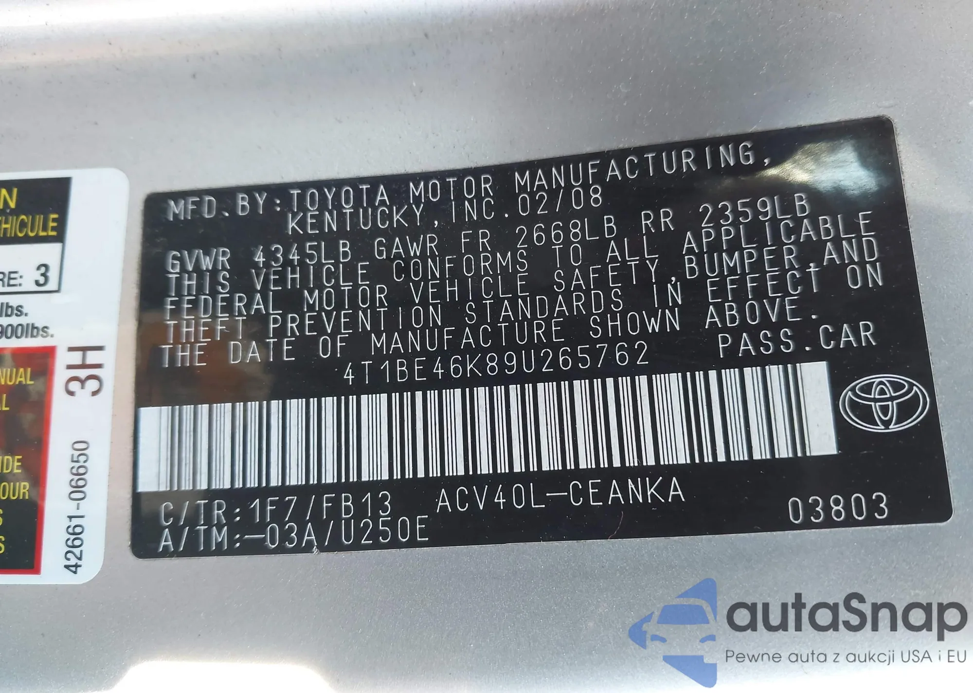 LOT: 44304116 VIN: 4T1BE46K89U265762