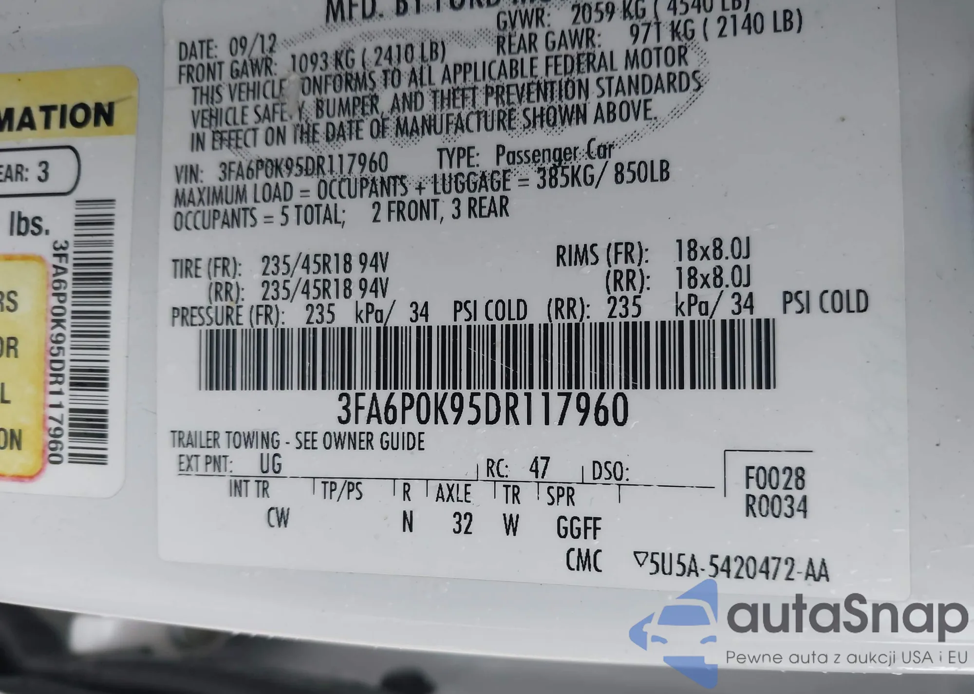 LOT: 43938245 VIN: 3FA6P0K95DR117960
