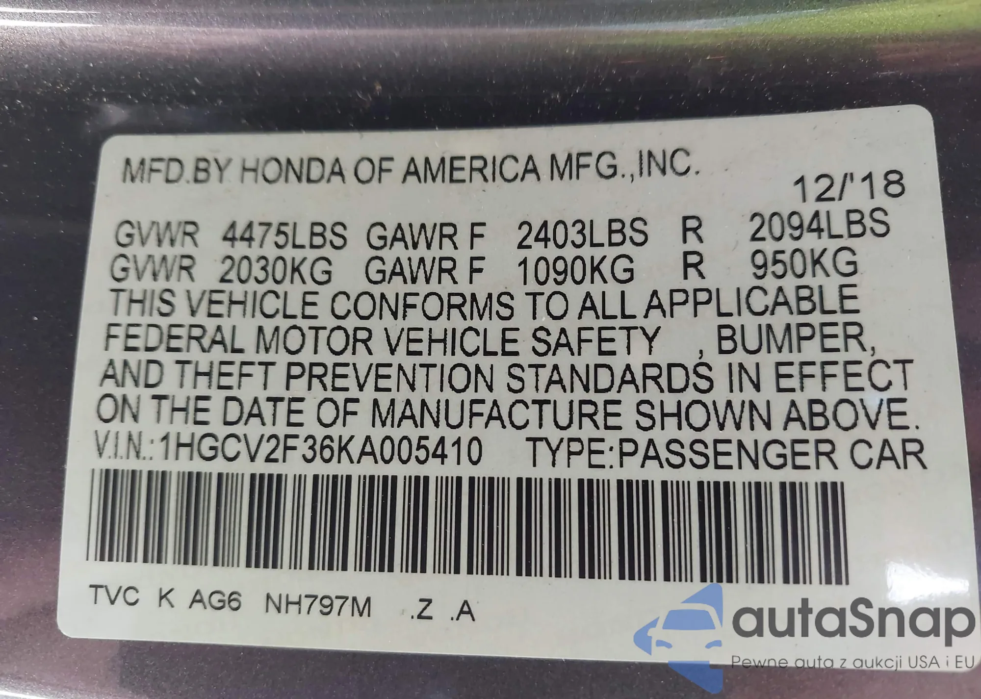 LOT: 44109887 VIN: 1HGCV2F36KA005410
