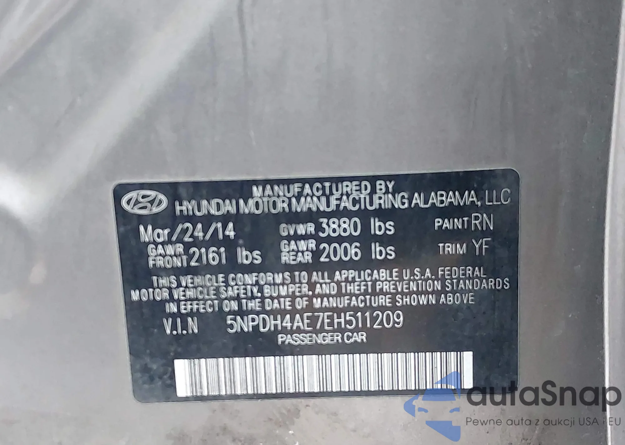 LOT: 43948747 VIN: 5NPDH4AE7EH511209
