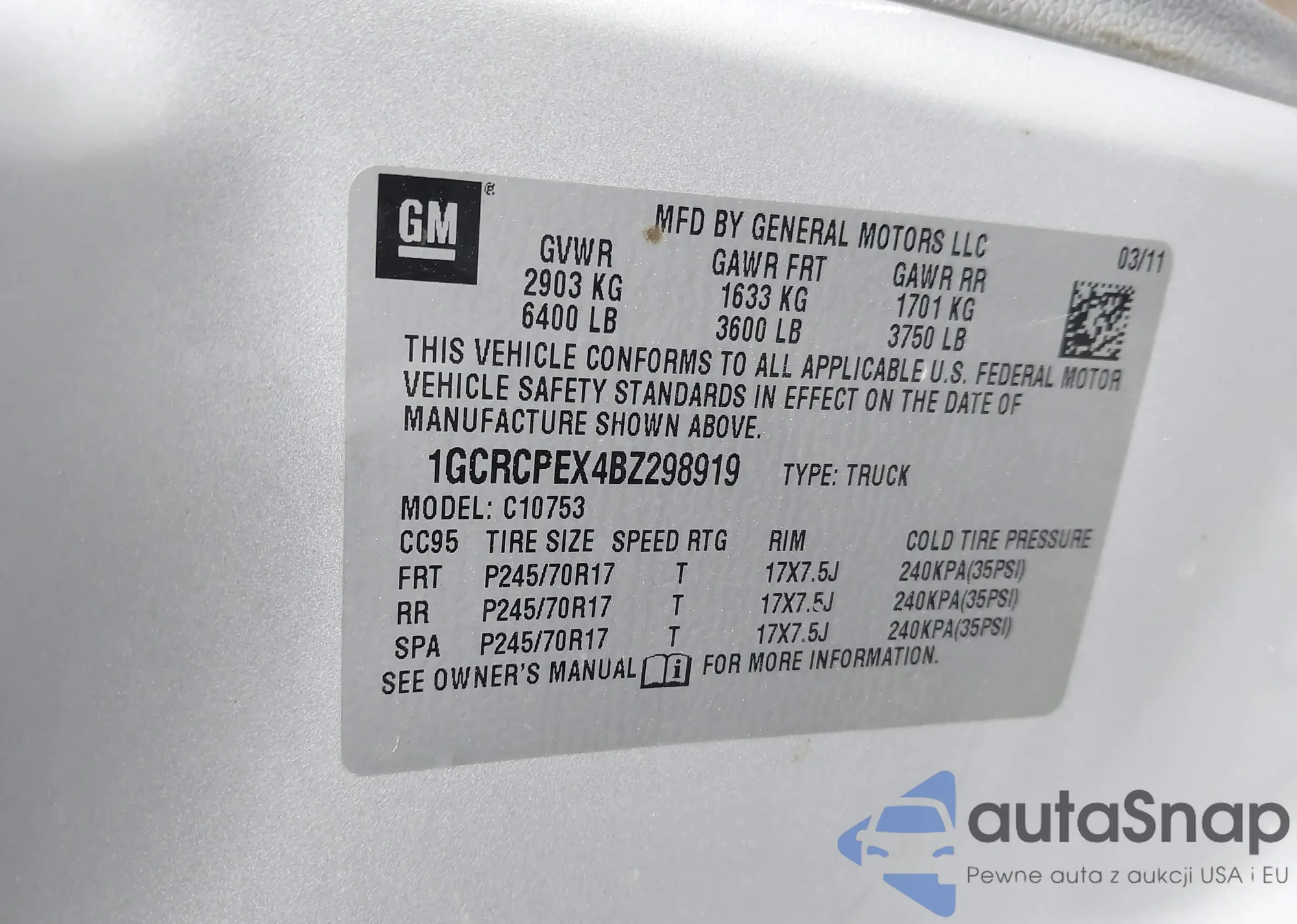 • VIN 1GCRCPEX4BZ298919