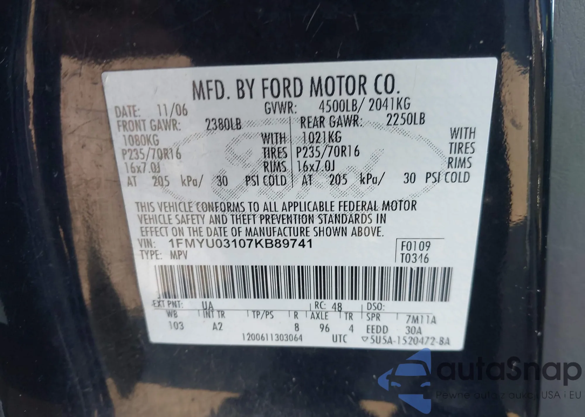 LOT: 44173148 VIN: 1FMYU03107KB89741