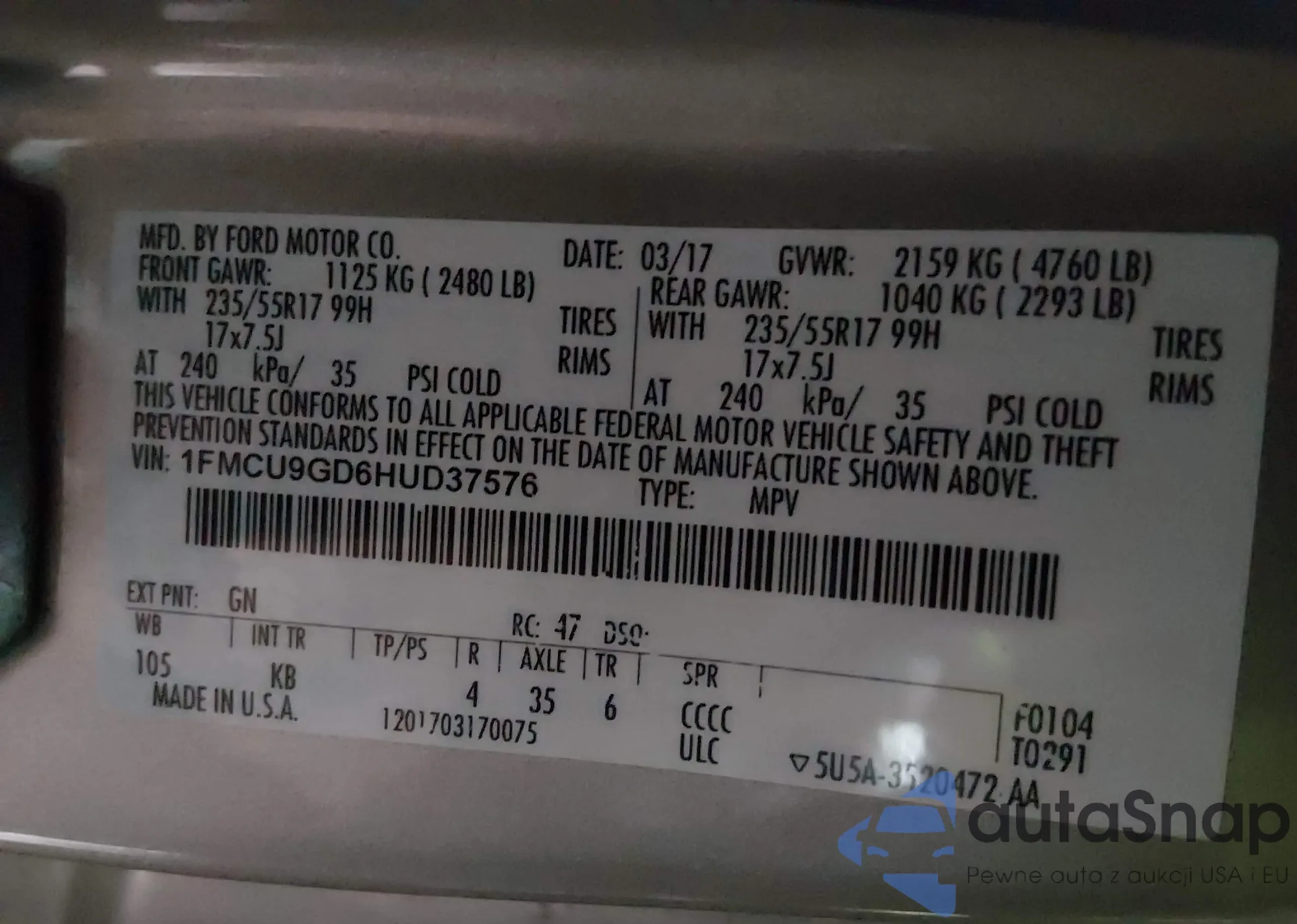 • VIN 1FMCU9GD6HUD37576