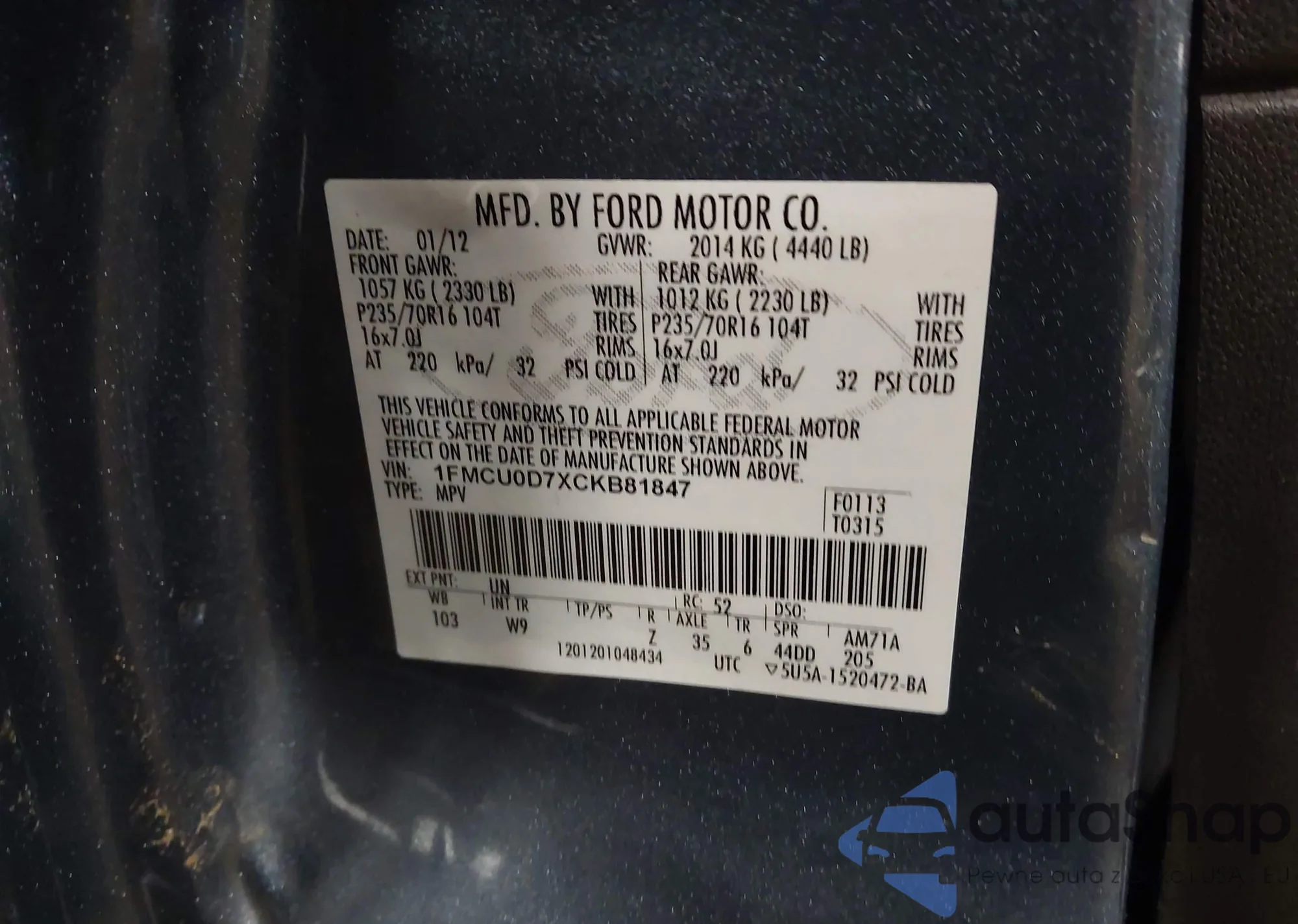 • VIN 1FMCU0D7XCKB81847