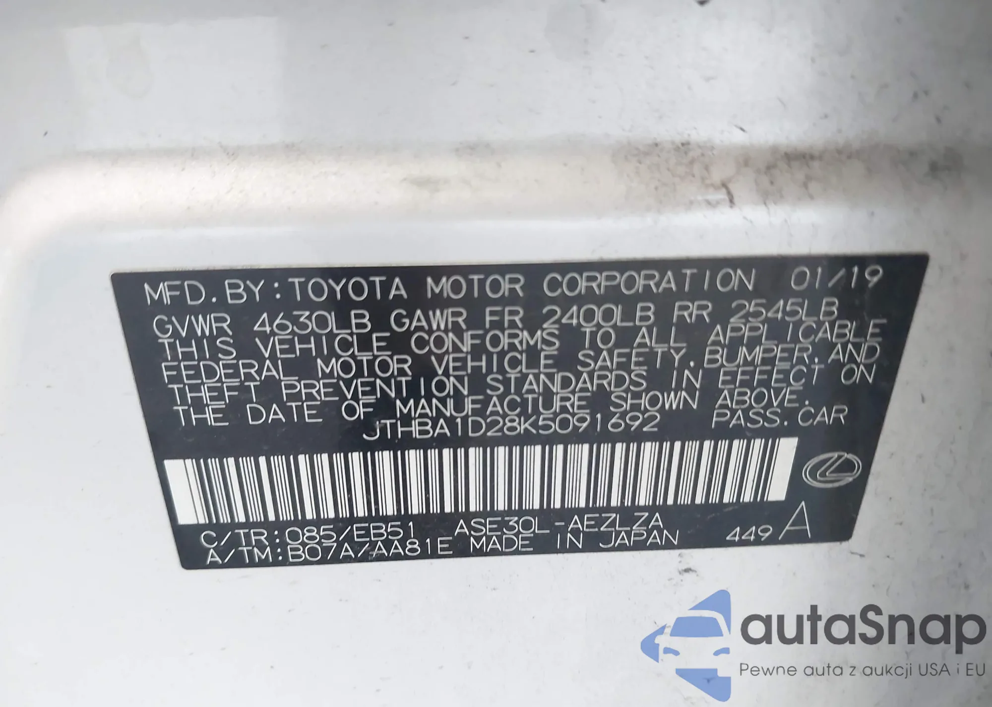 LOT: 44030124 VIN: JTHBA1D28K5091692