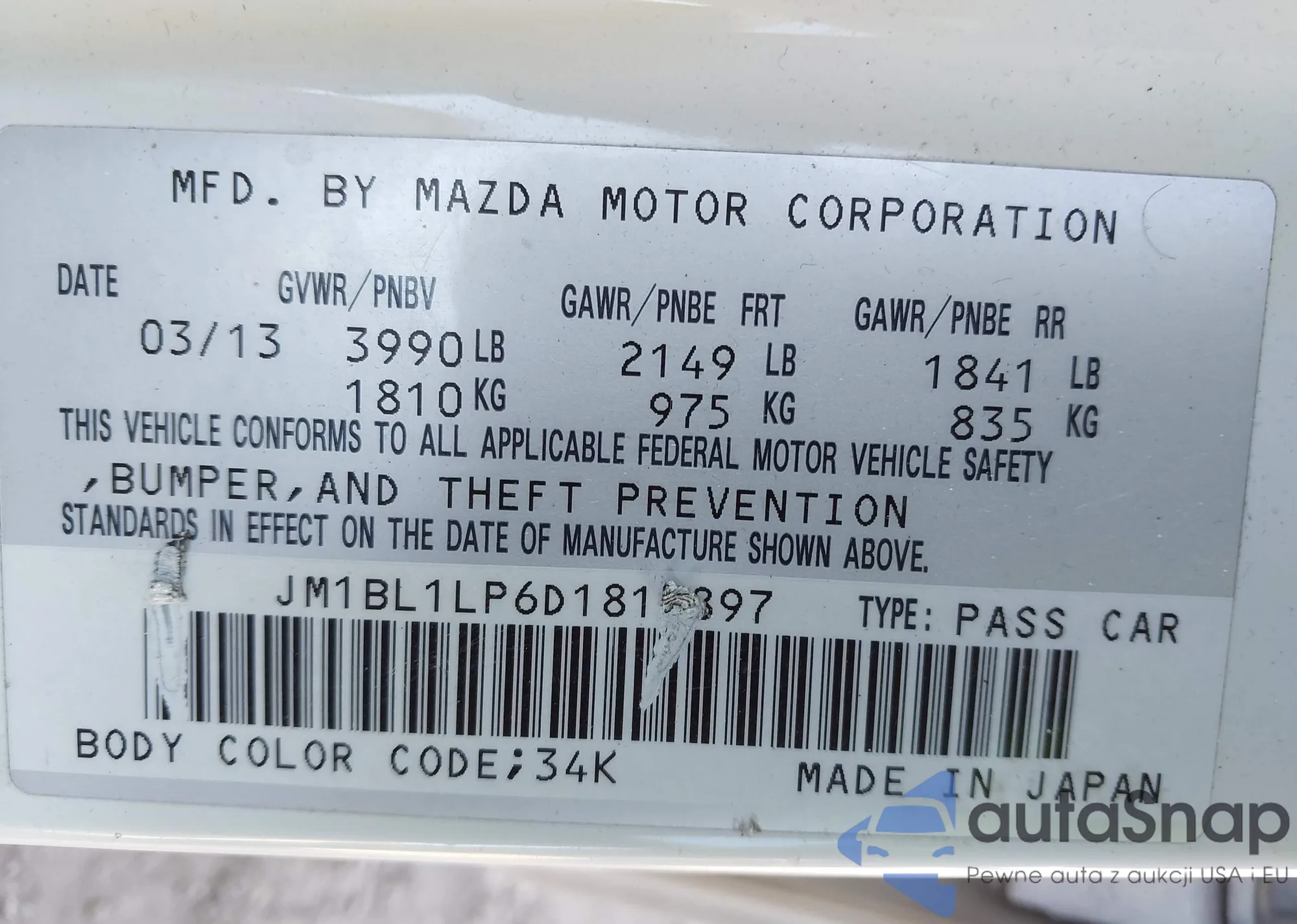 LOT: 44039413 VIN: JM1BL1LP6D1815897