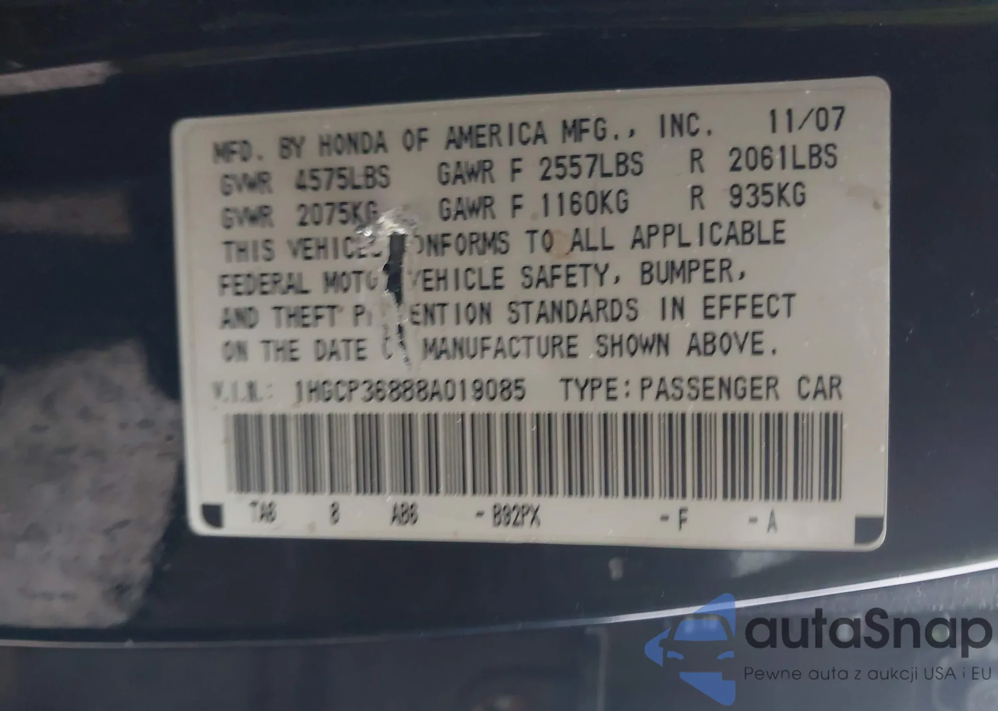LOT: 44084423 VIN: 1HGCP36888A019085