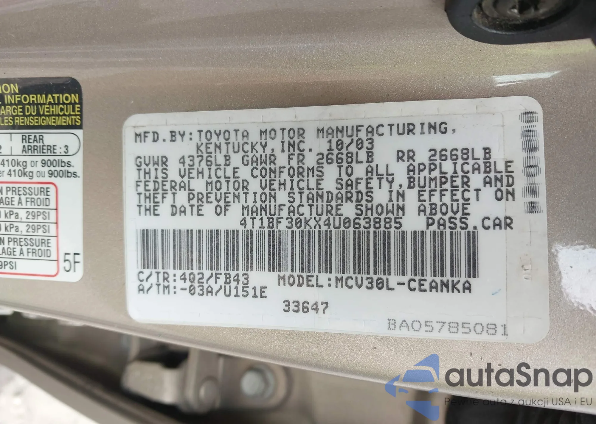 LOT: 43934012 VIN: 2T2ZK1BA5BC048644