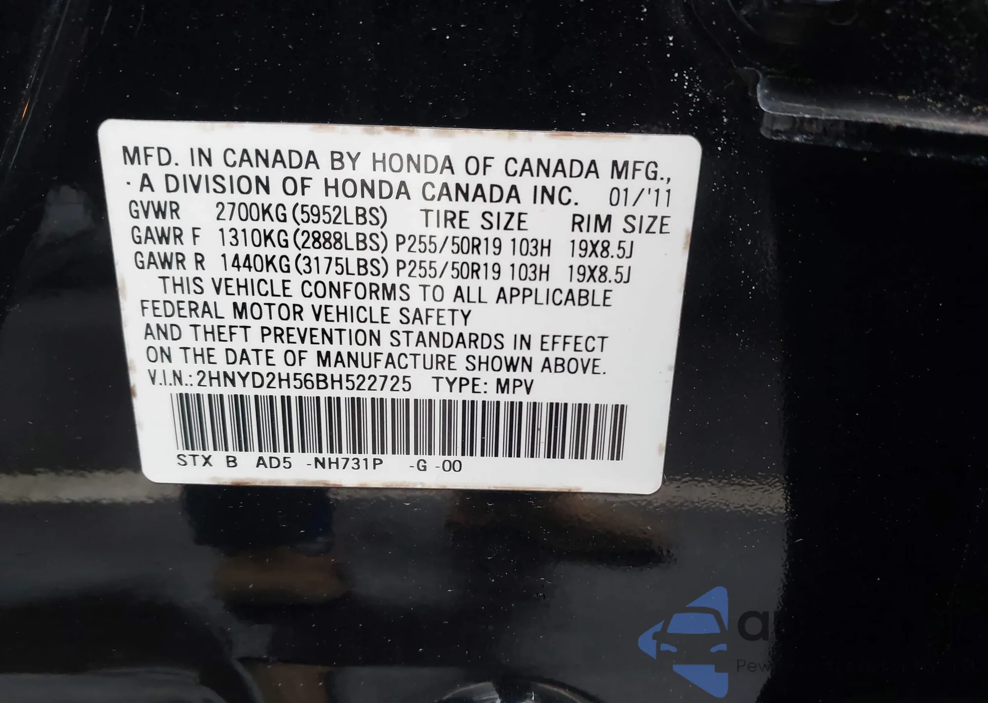 LOT: 44151668 VIN: 2HNYD2H56BH522725
