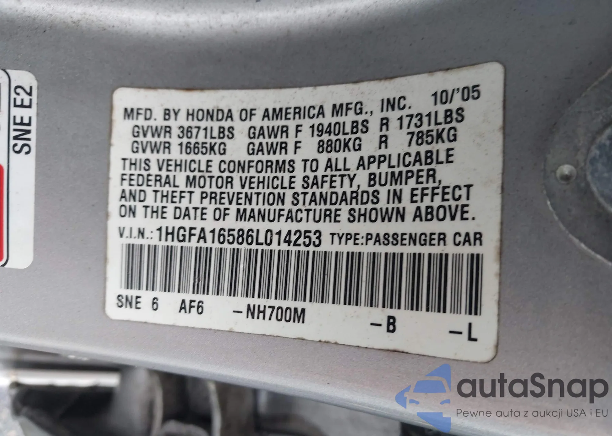 LOT: 44083818 VIN: 1HGFA16586L014253