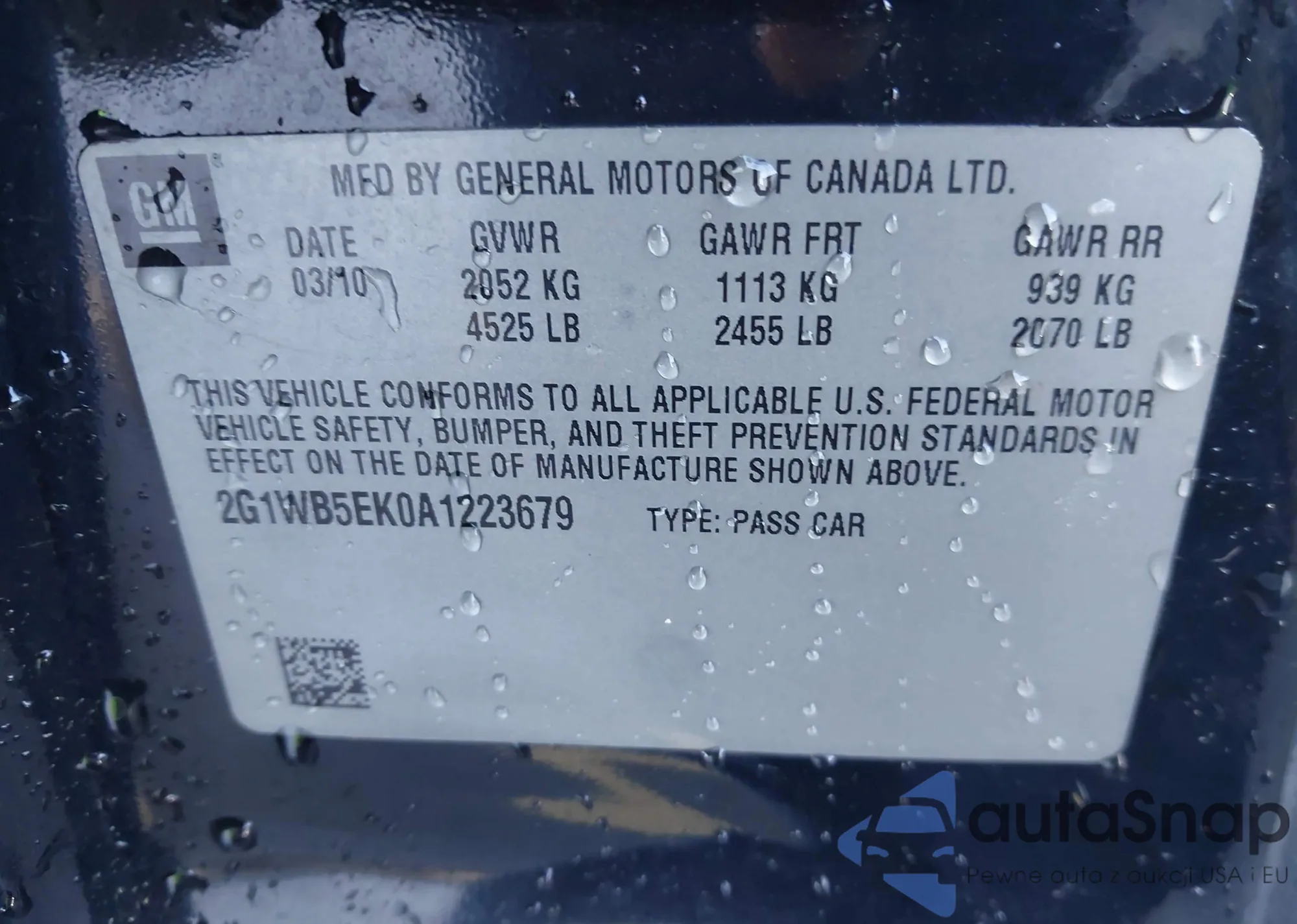 LOT: 44120070 VIN: 2G1WB5EK0A1223679
