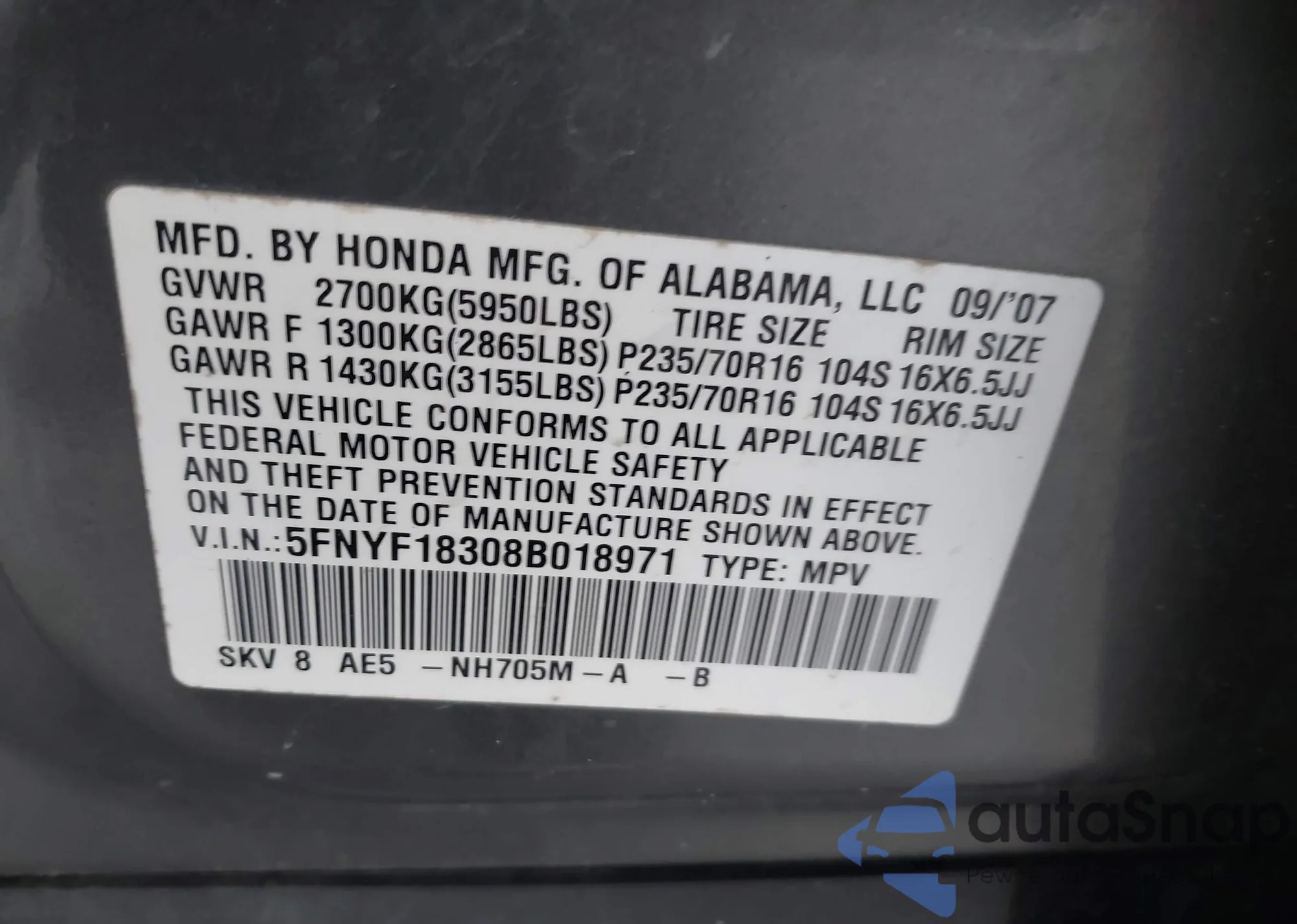 • VIN 5FNYF18308B018971