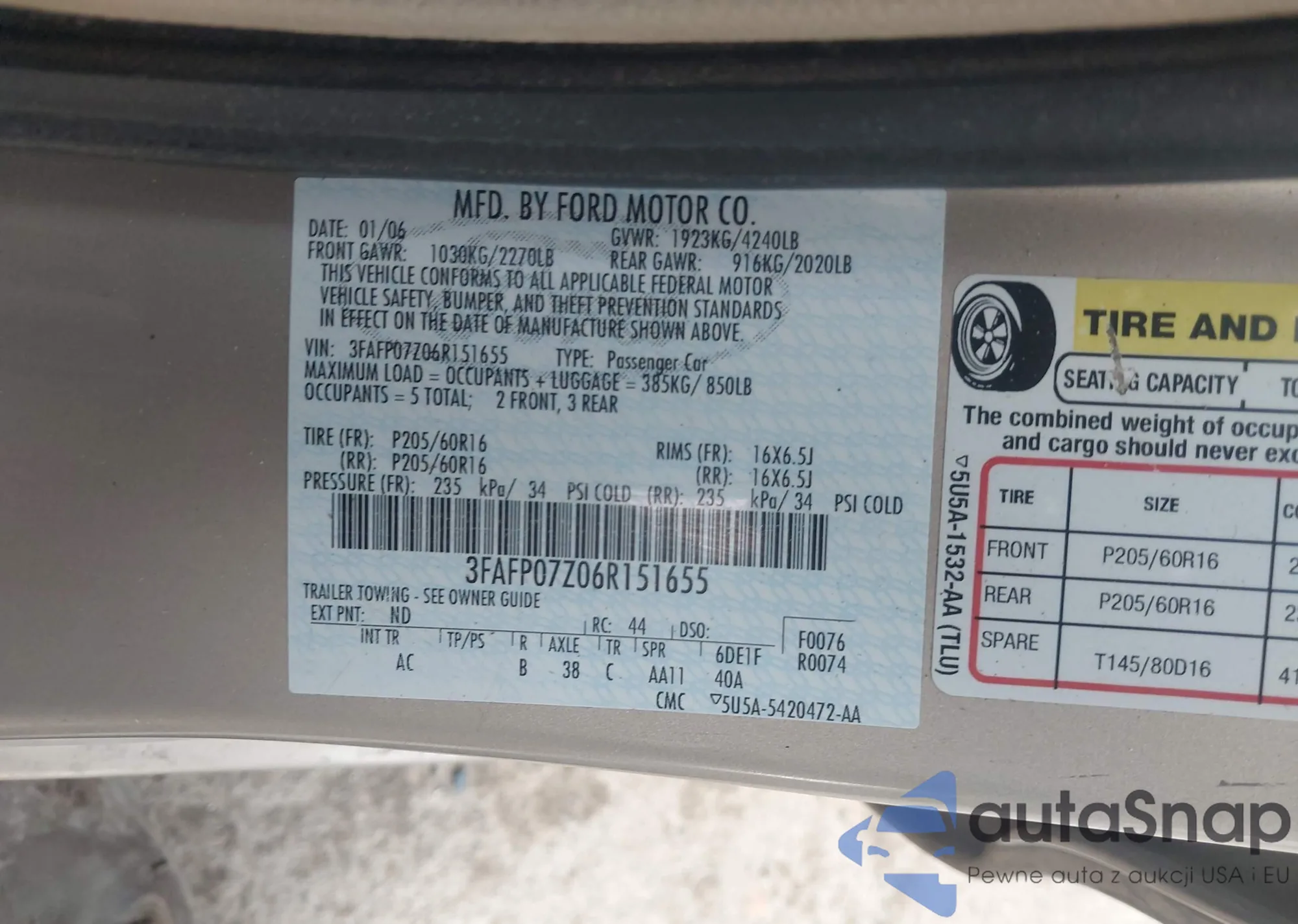• VIN 3FAFP07Z06R151655