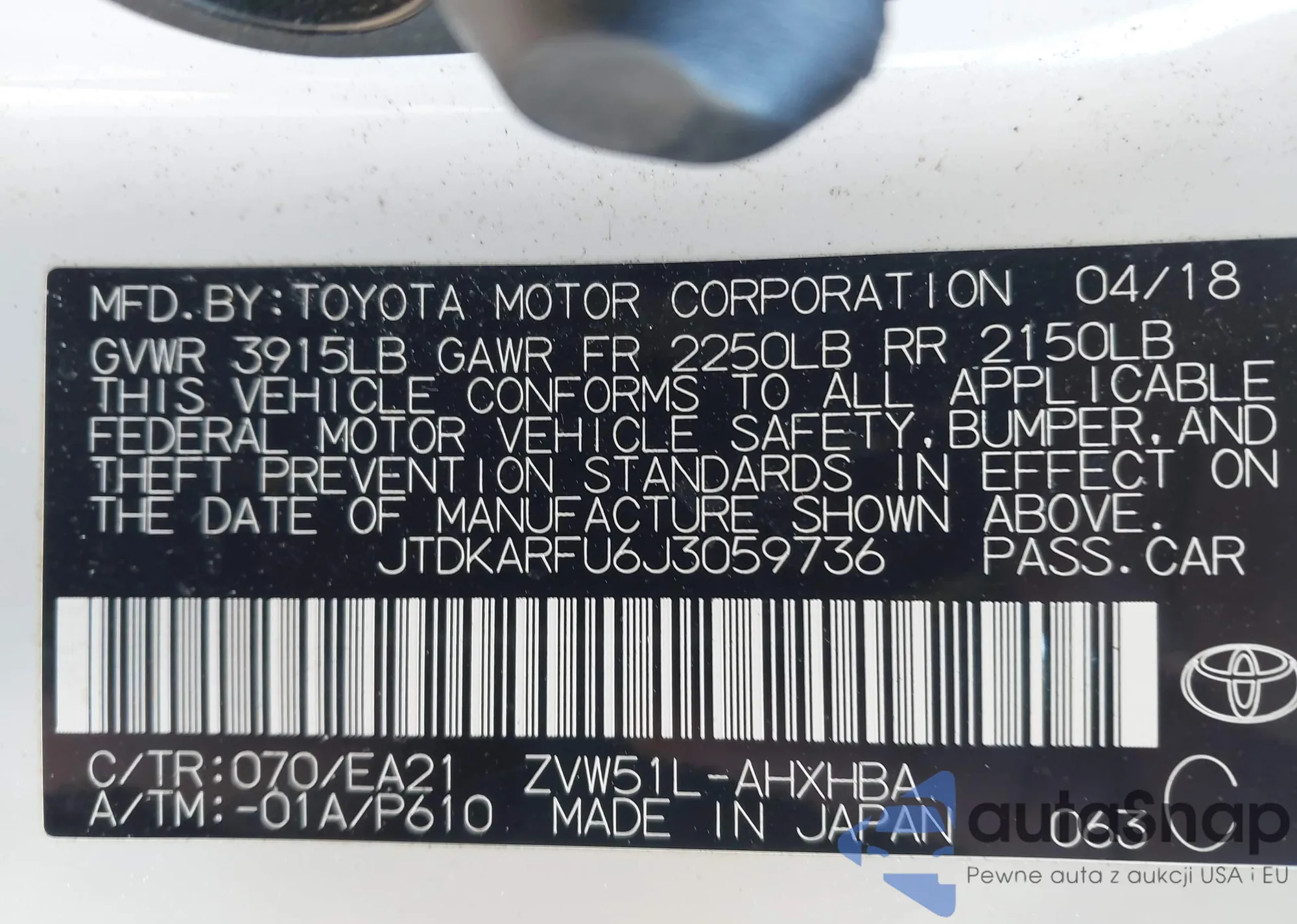 LOT: 44197525 VIN: JTDKARFU6J3059736