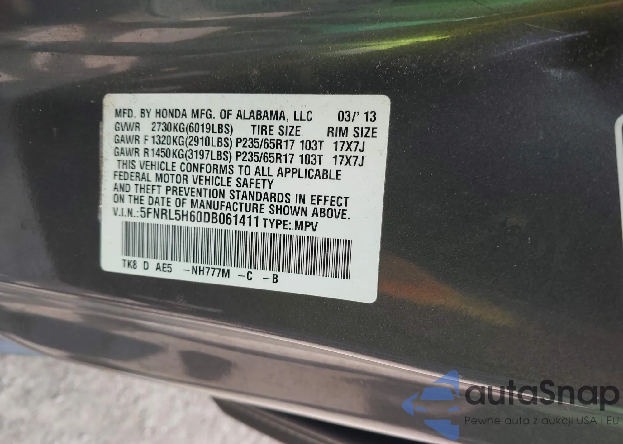 • VIN 5FNRL5H60DB061411