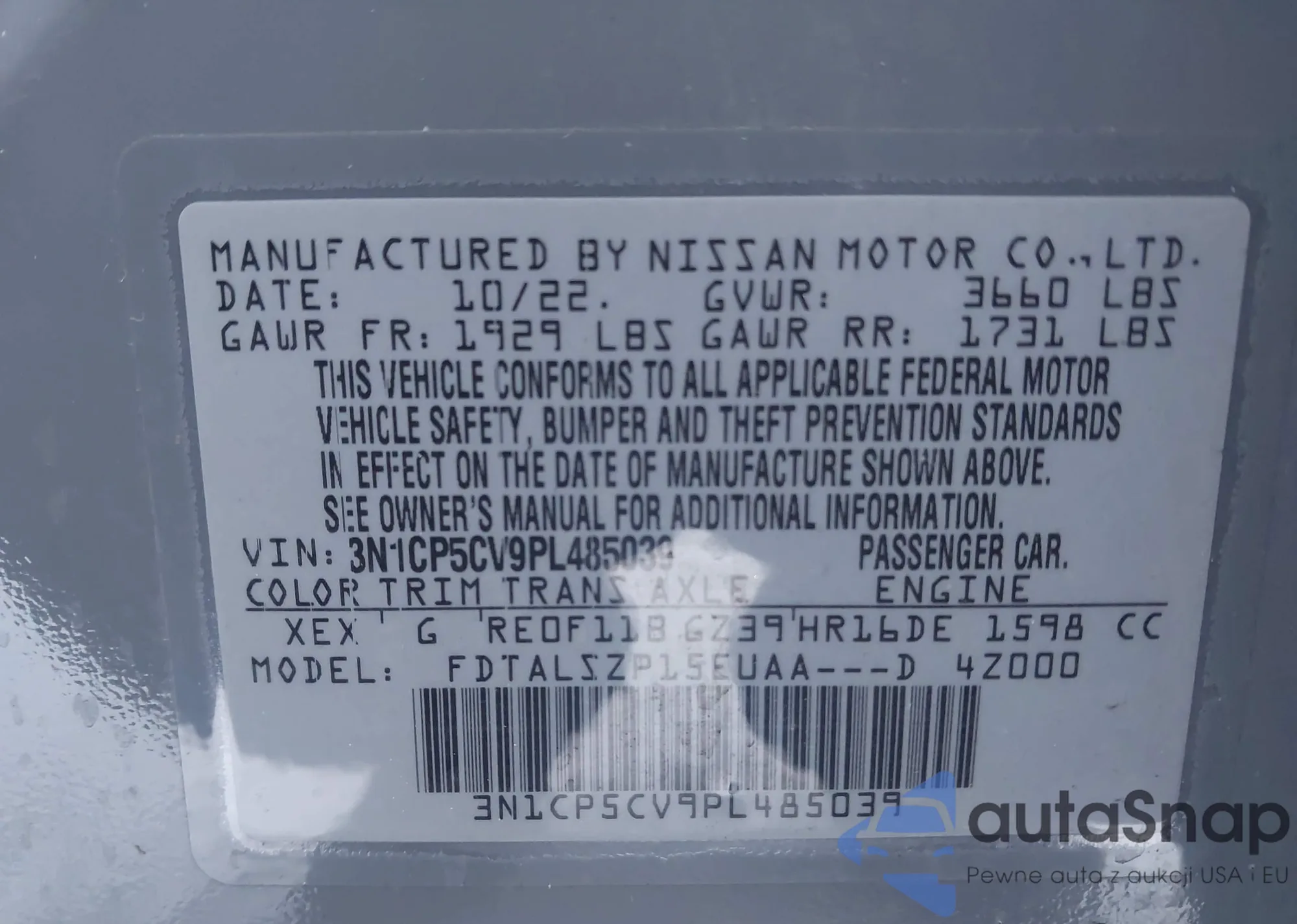 LOT: 43984300 VIN: 1N4AL3AP2FC271910