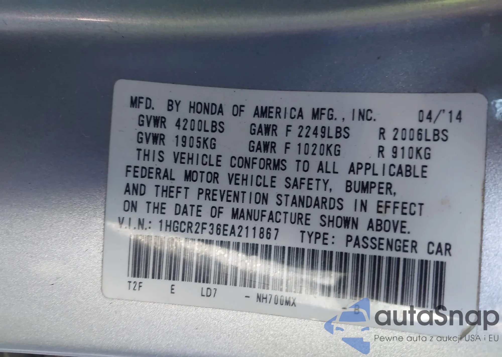 • VIN 1HGCR2F36EA211867