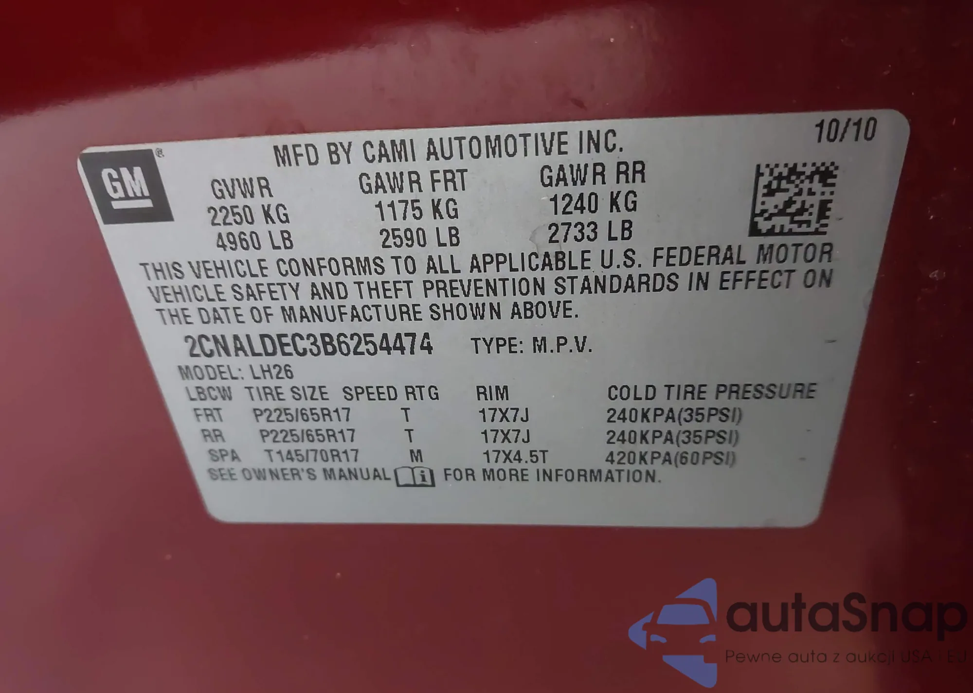 • VIN 2CNALDEC3B6254474