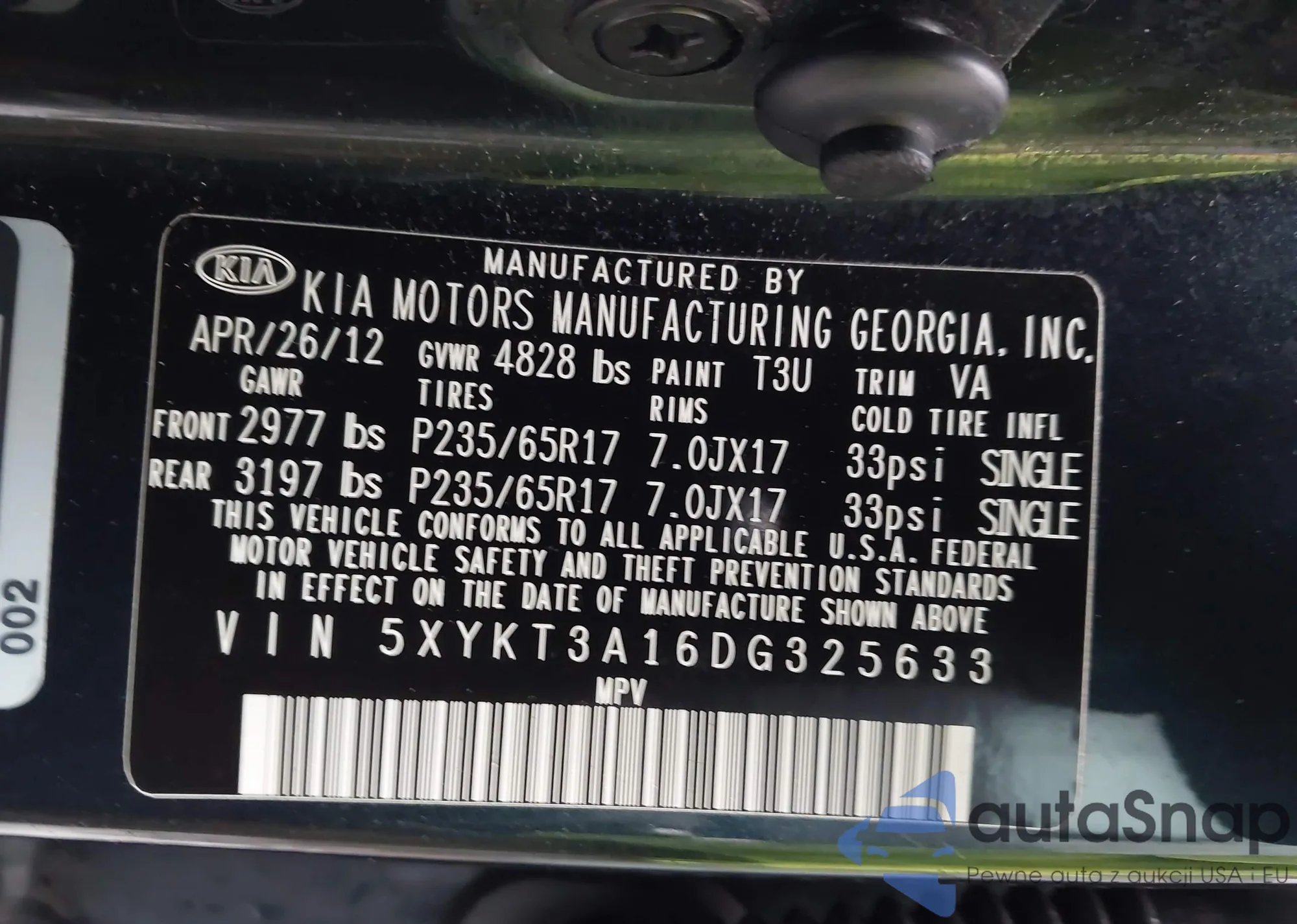 LOT: 44030033 VIN: 5XYKT3A16DG325633