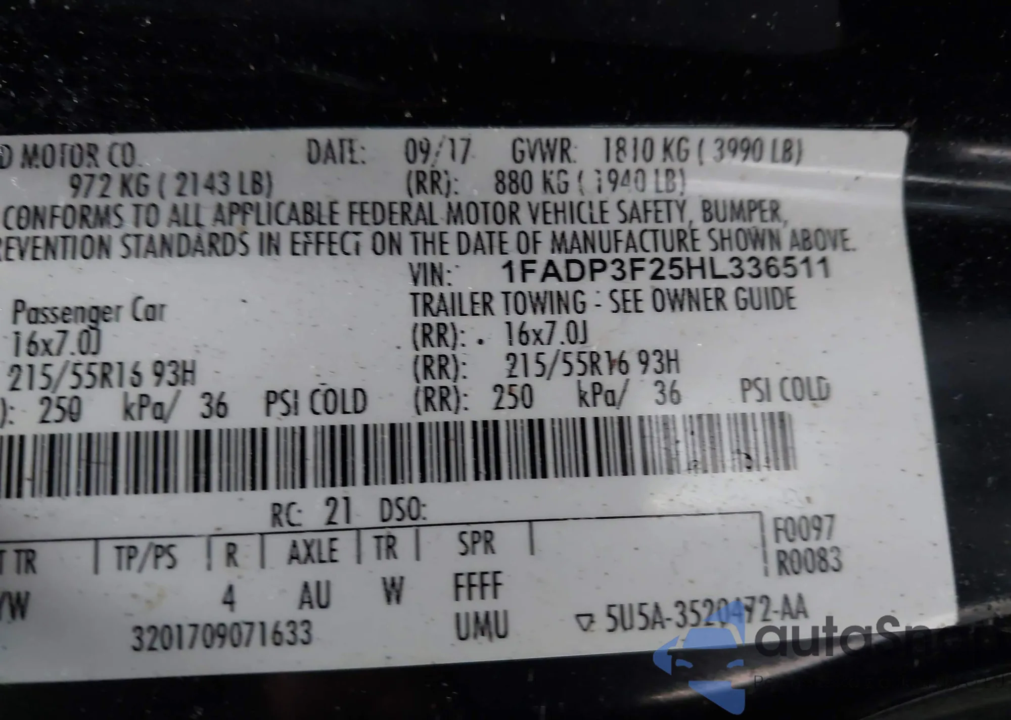 • VIN 1FADP3F25HL336511